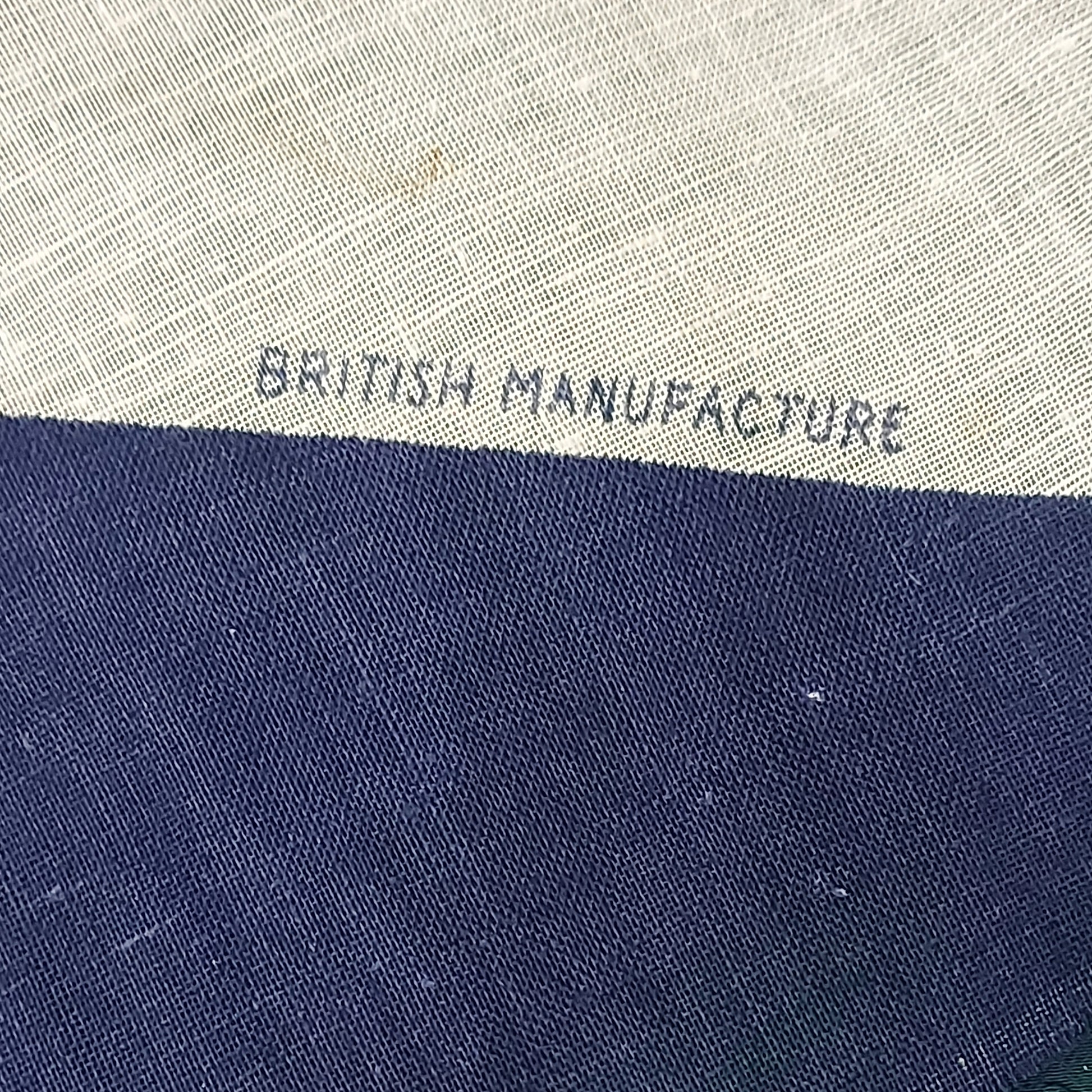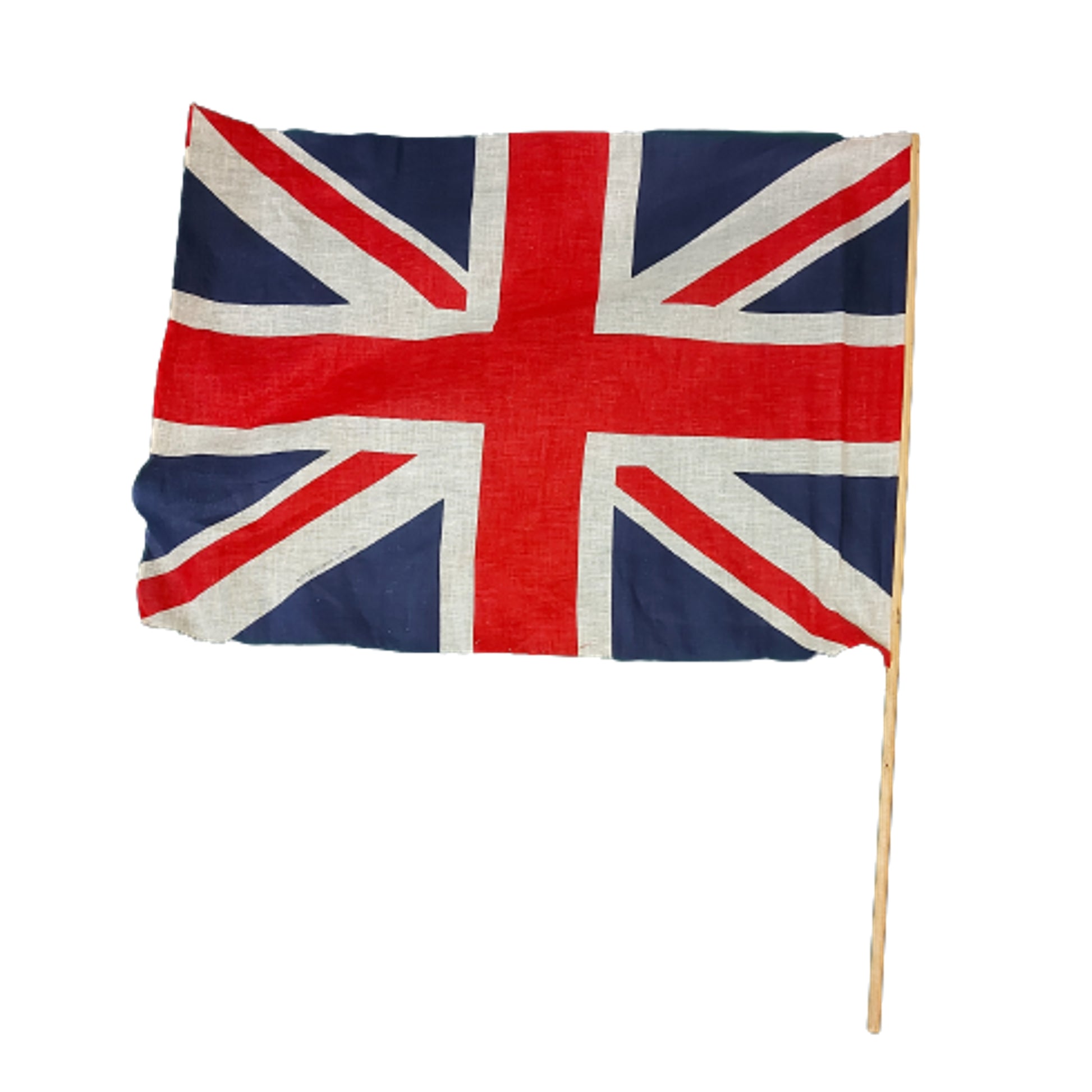 Printed cotton flag measuring 23 by 17.5 inches and mounted on a 28 inch wooden staff. Flag is marked, British Manufacture