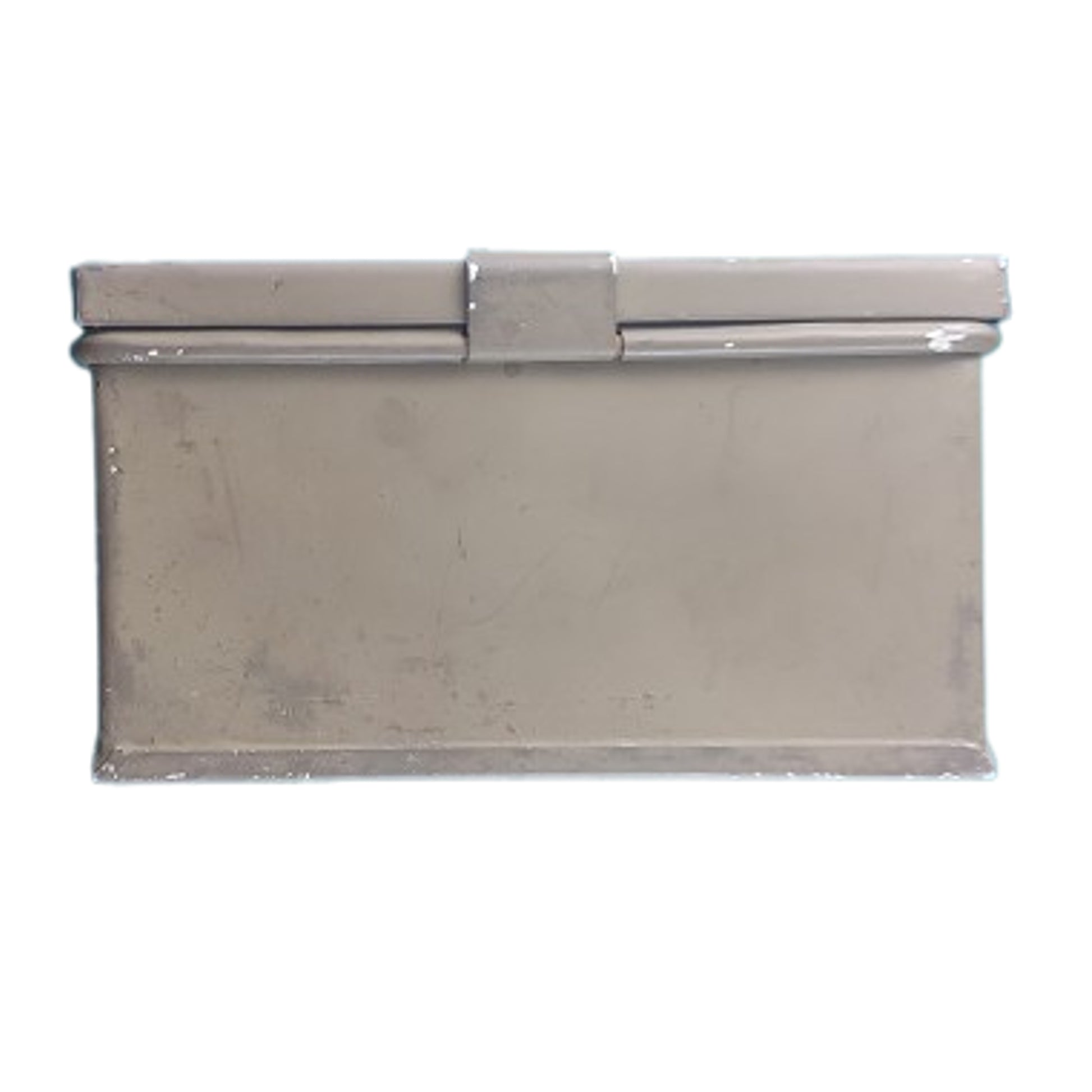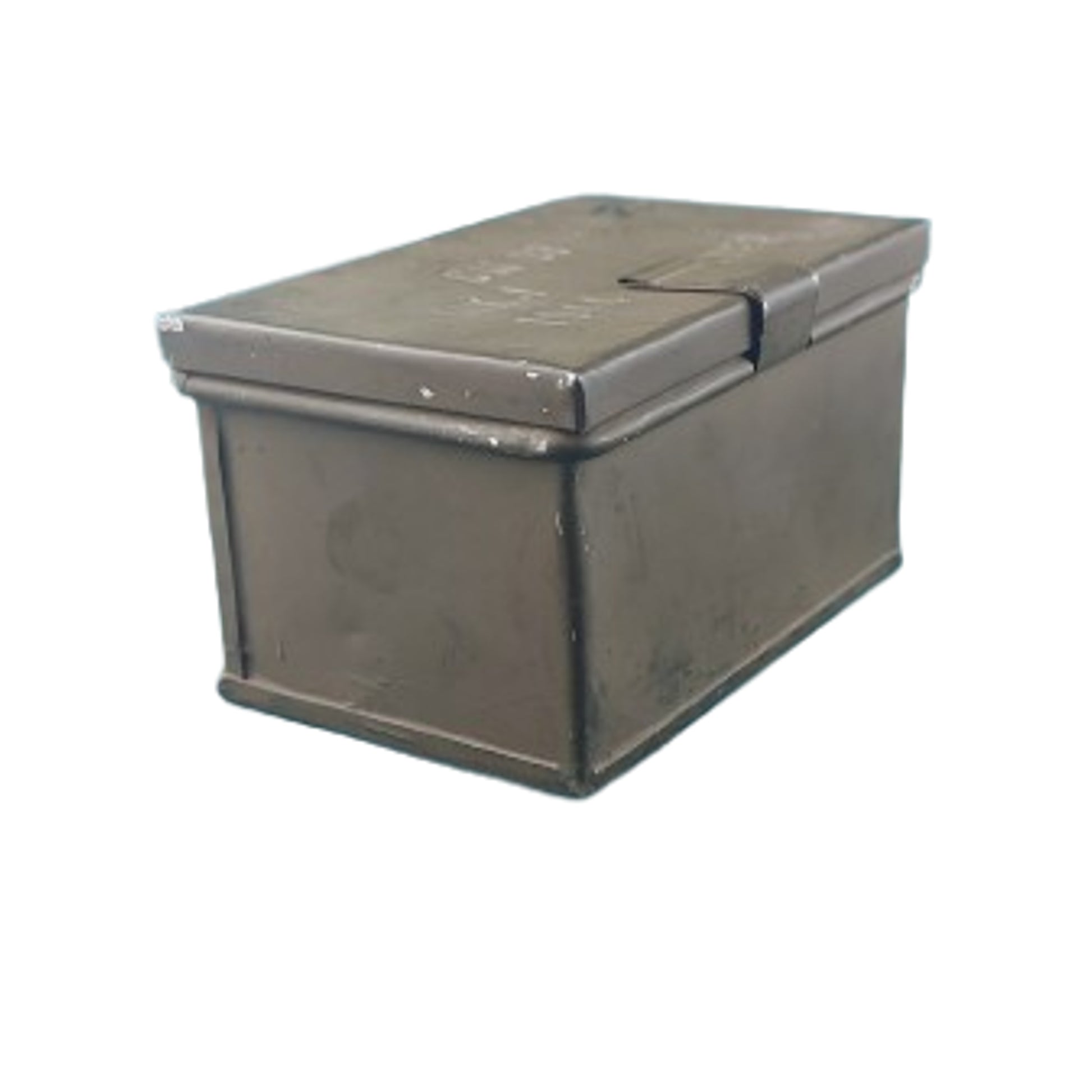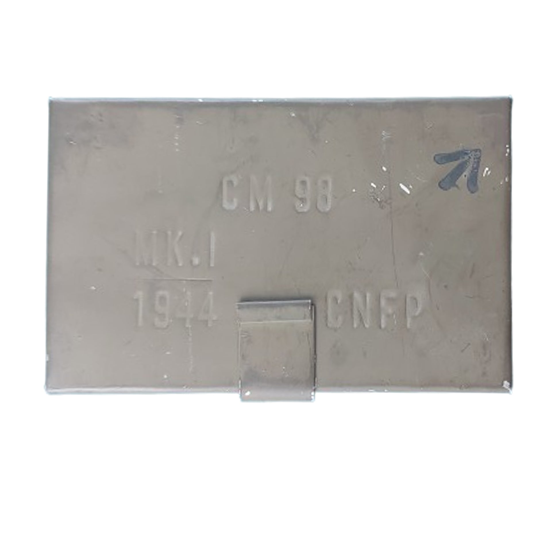 WW2 British Canadian CM98 Radio Spare Parts Tin constructed of sheet metal that measures 3 1/2 by 2 1/2 by 2 1/4 inches with a hinged top lid that is marked CM98, Mk.I, CNFP, and dated 1944 with a British Broadarrow stamp. Some small parts to the interior. SKU: 62895