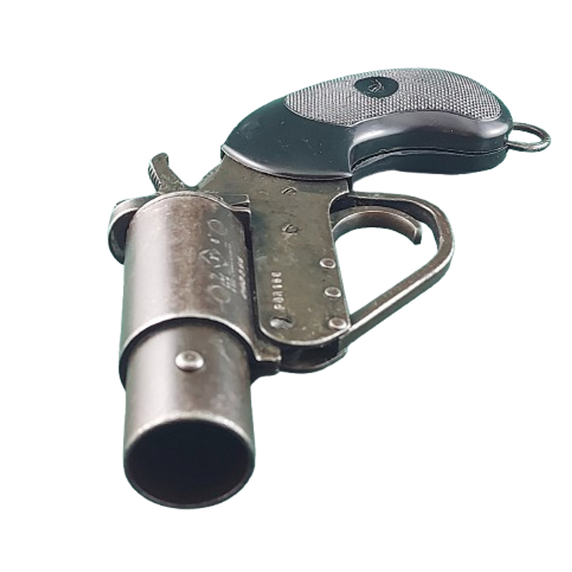 Used by British & Commonwealth Military Forces during WW2. Steel construction, single shot, single action, break open flare pistol with a 3 3/4 inch round barrel, and 2 piece checkered bakalite grips with a steel lanyard ring below. Very well marked to the left side of the barrel. Used by Air Crews for use in the life rafts. Mechanically excellent and functioning correctly. Shows some finish loss with expected use and wear. SKU: 62647 No PAL required. CANADIAN SALES ONLY.
