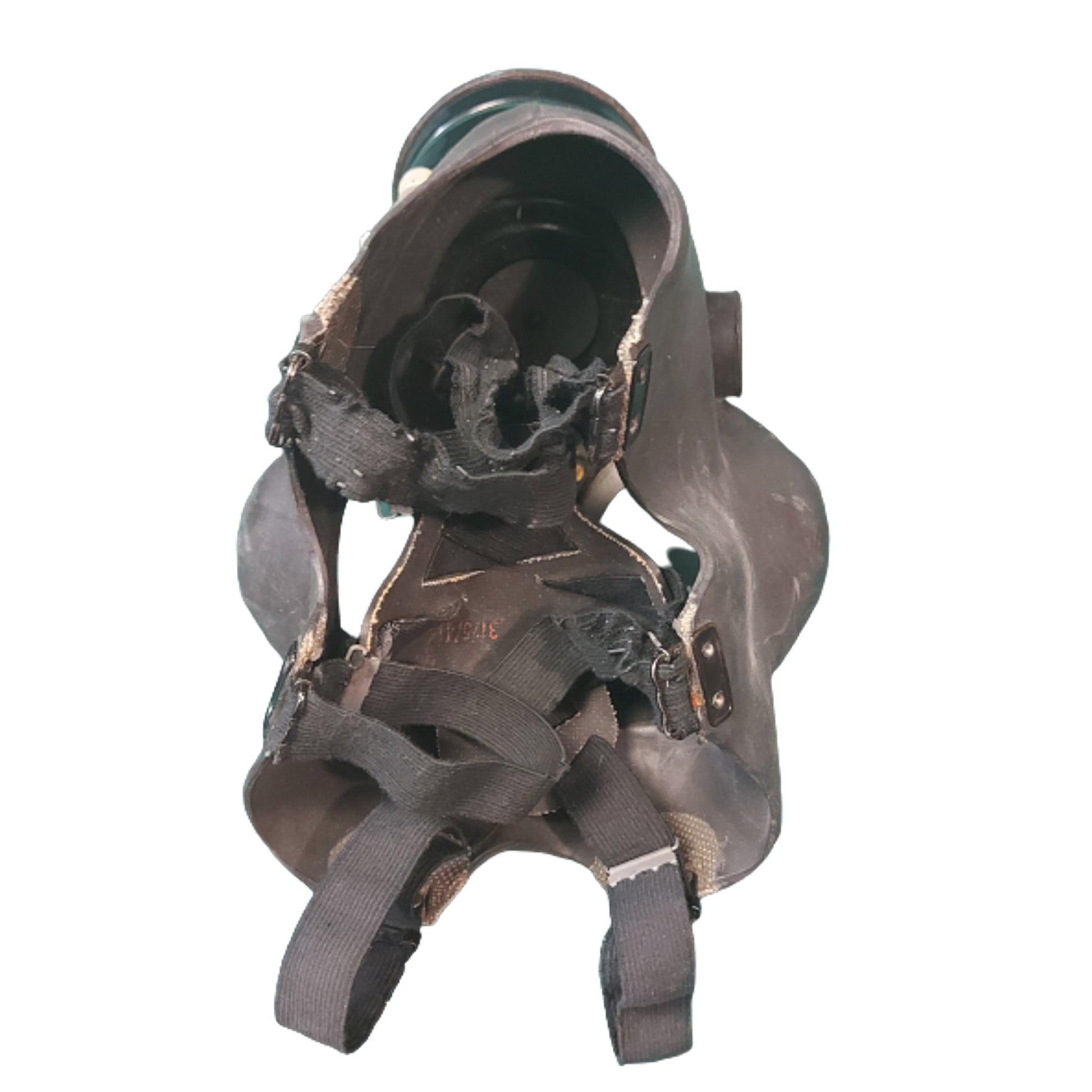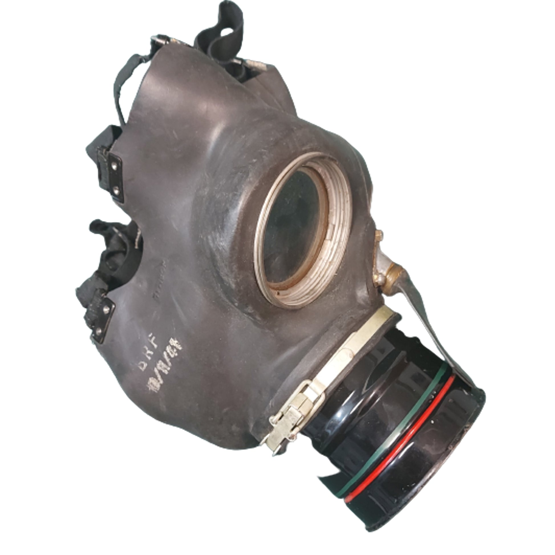 Rubber gas mask with glass lenses in place and without damage. Well marked and with a port to the left side for the attachment of a microphone. In named and dated carrier. SKU: 59116