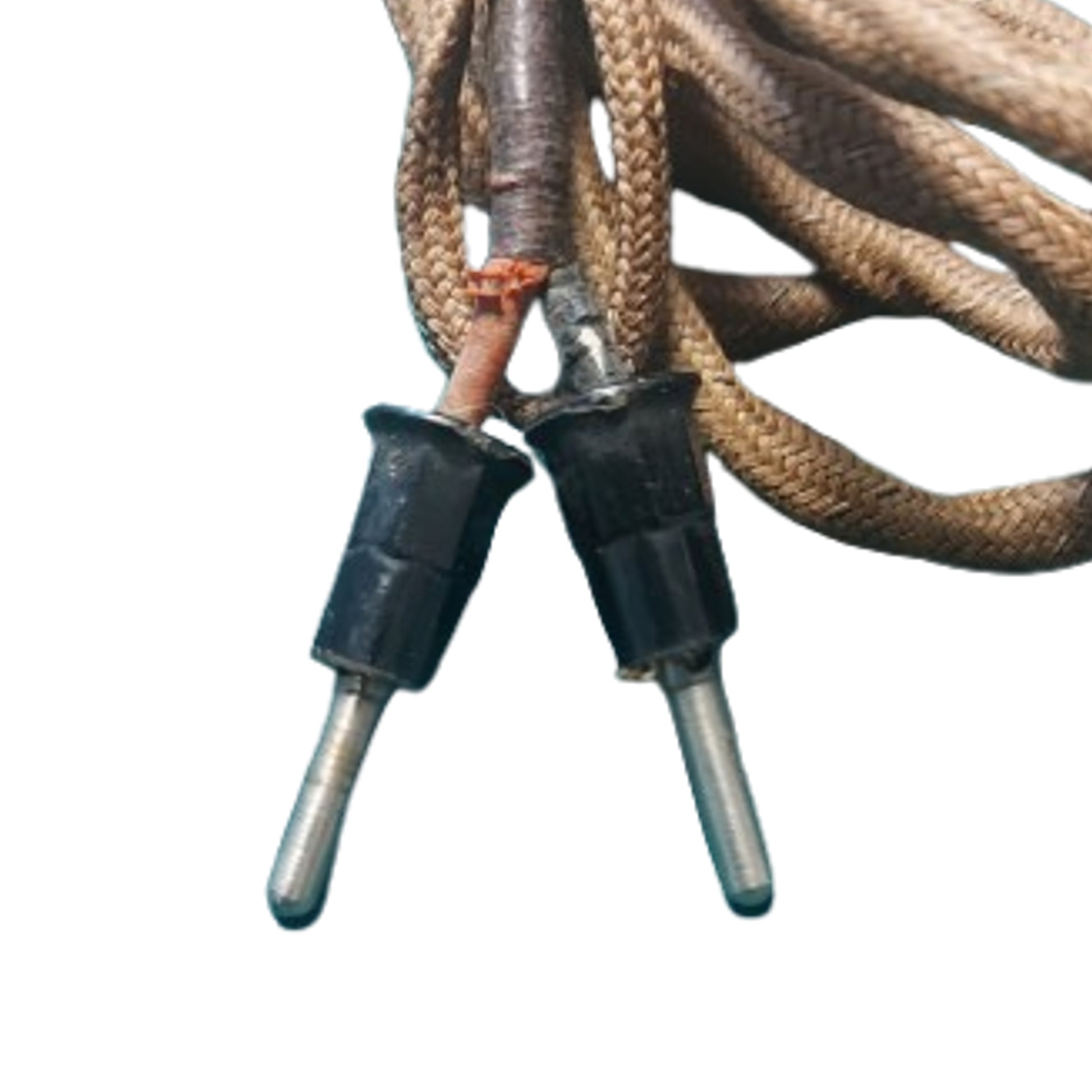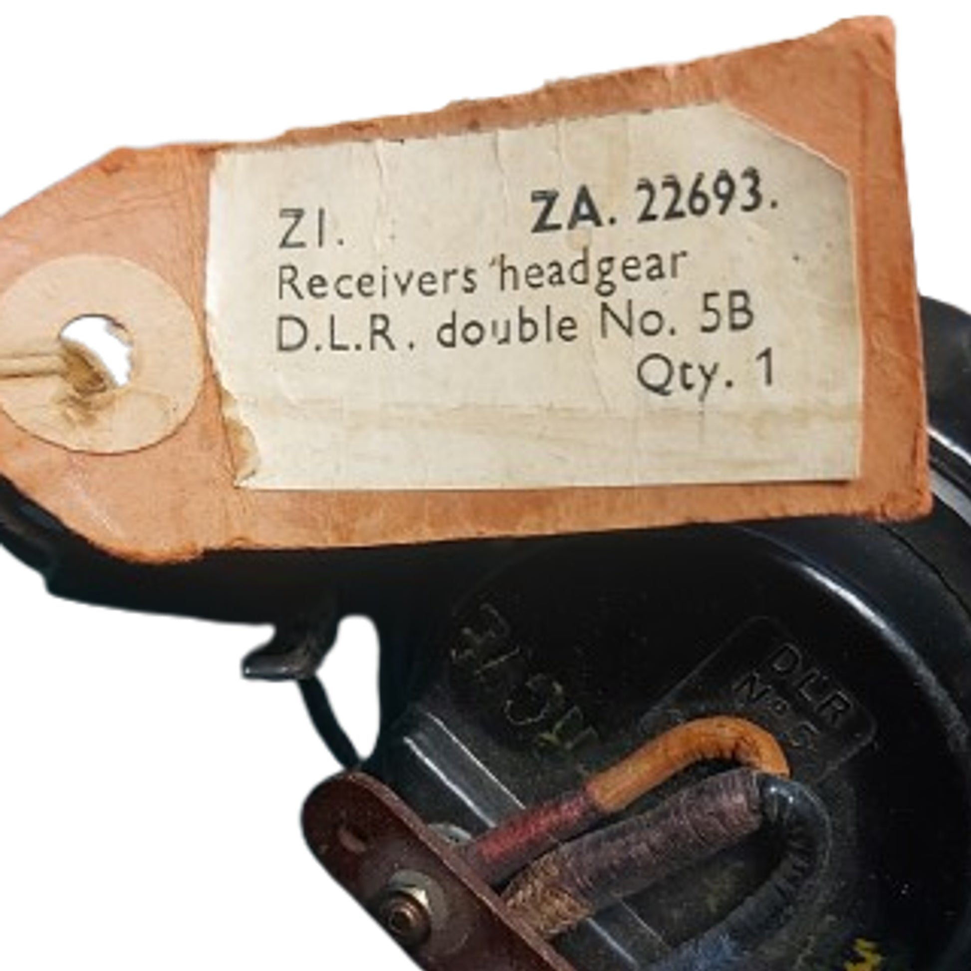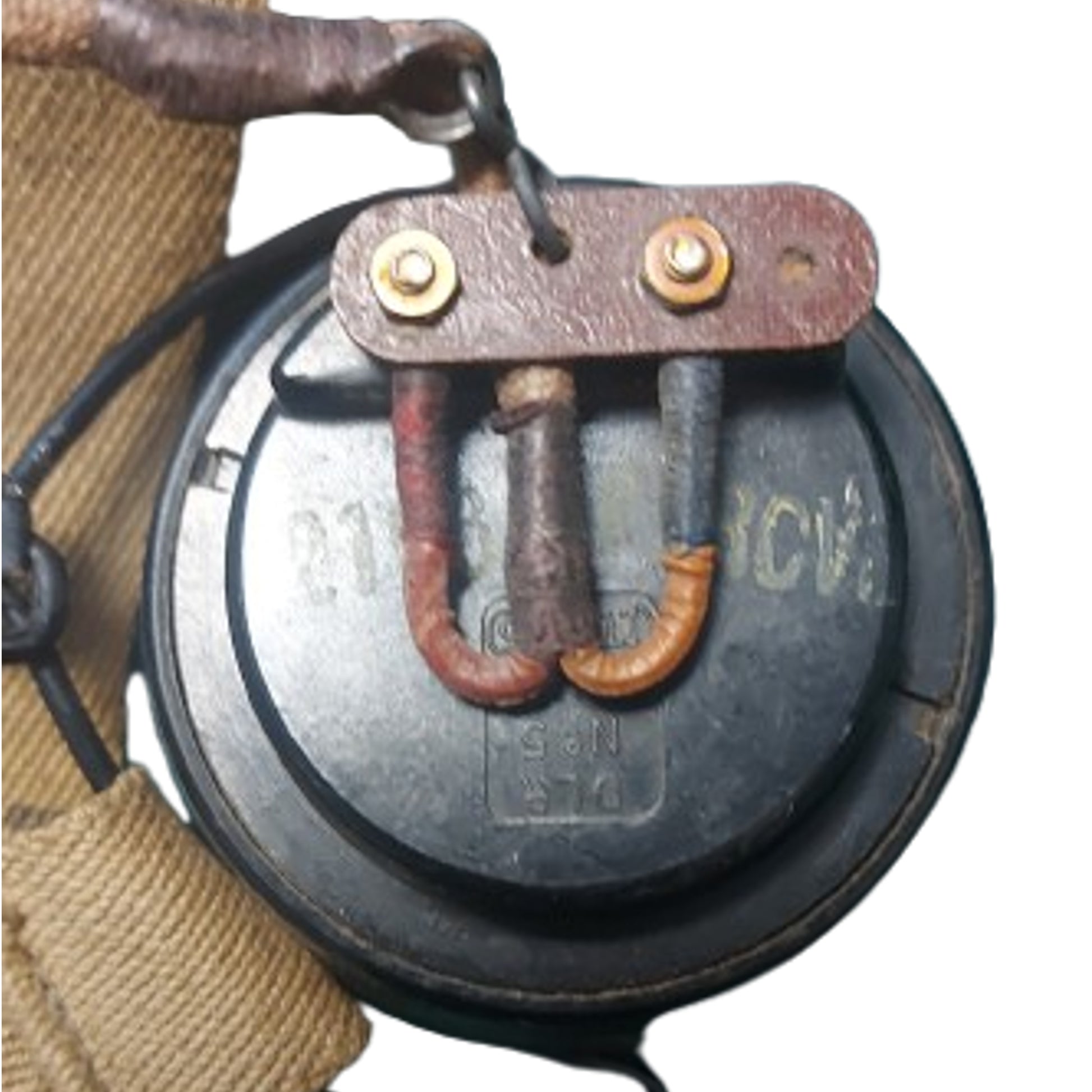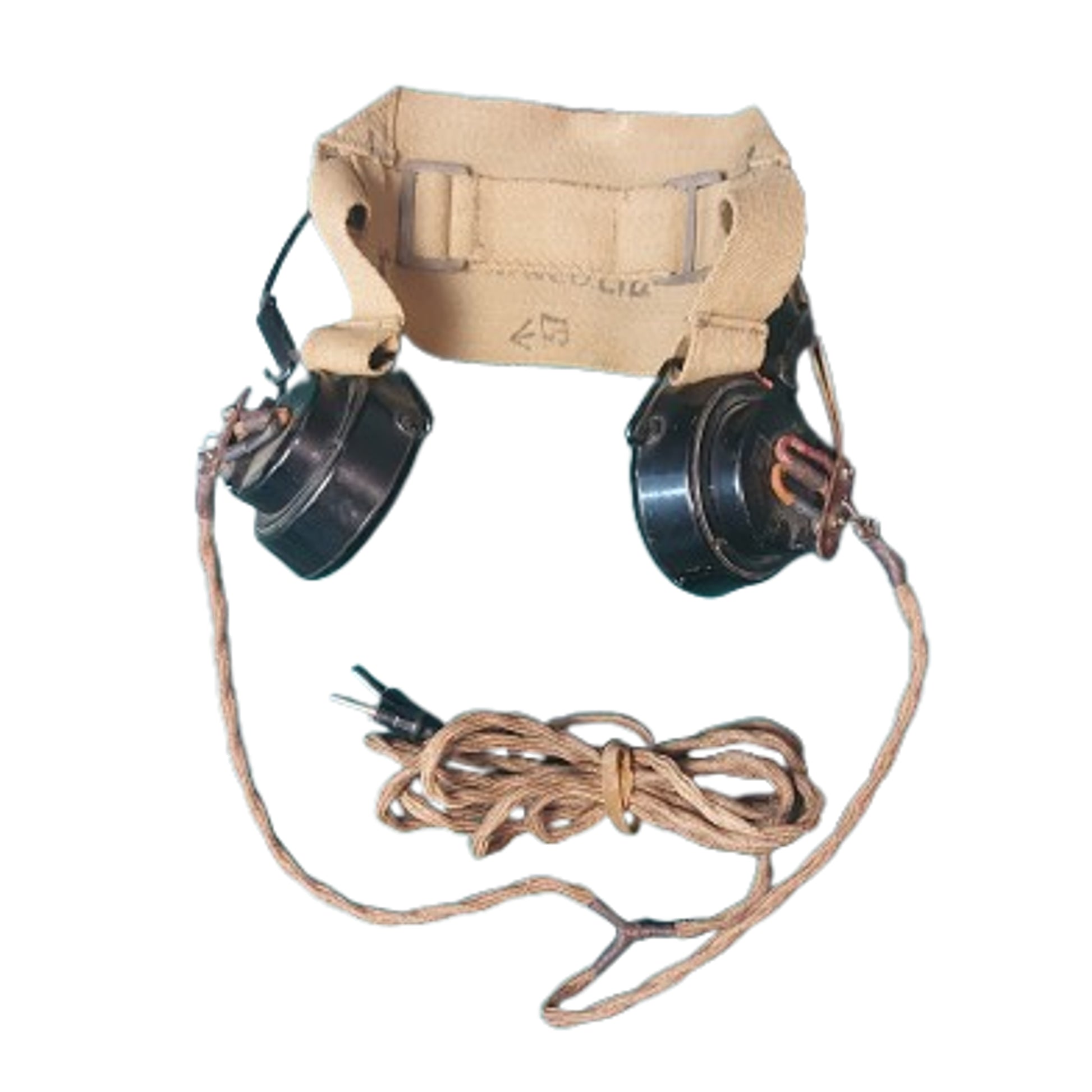 Black bakalite earpieces with a maker marked webbed headstrap with part number and a British Broadarrow stamp. 2 small single prong plugs to the end of the braided cotton cord. British military tag also in place. SKU: 62907