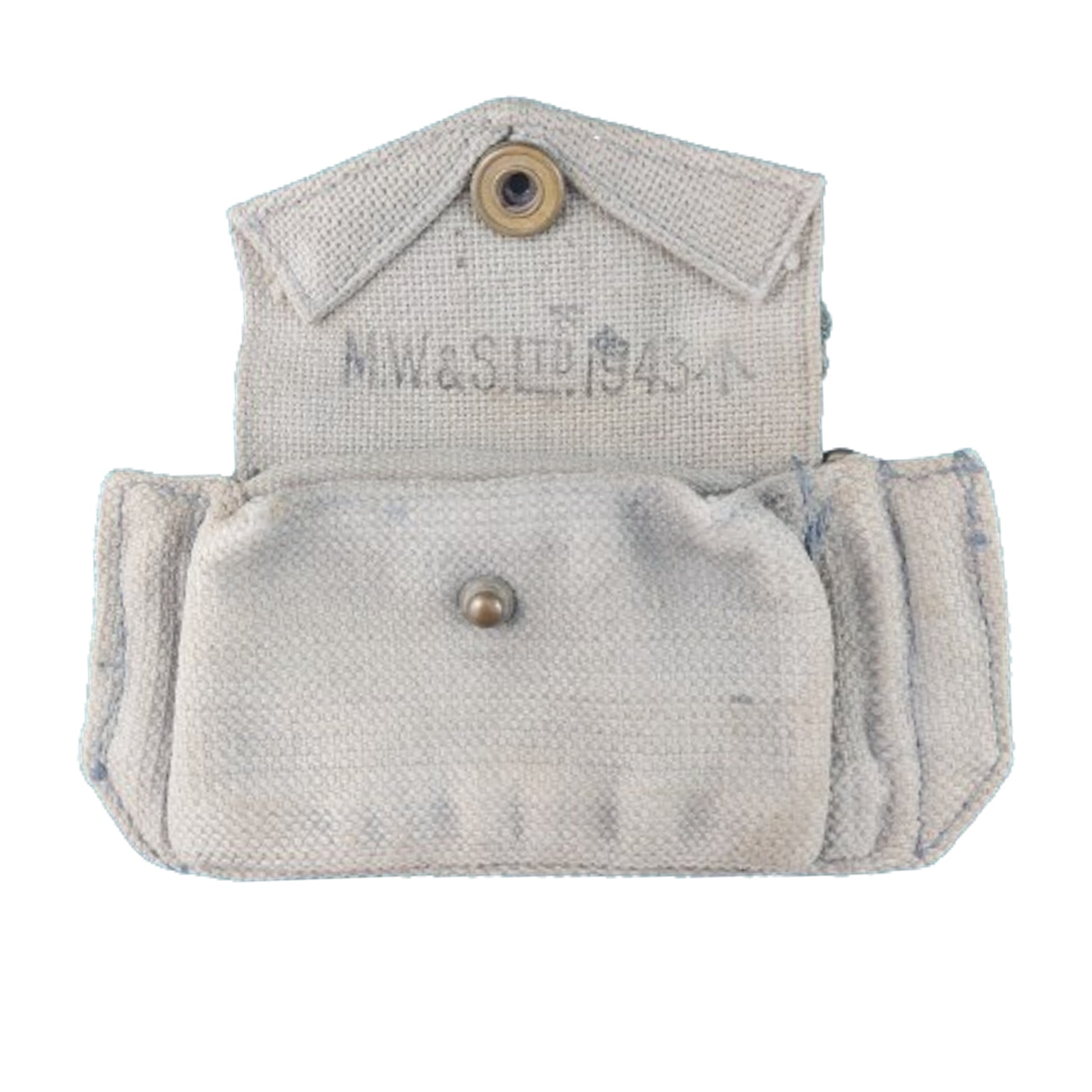 Webbed material construction with brass fixtures. Maker marked to the interior of the closure flap, M.W. & S. Ltd" and dated 1943 with a British Broadarrow. Shows use and wear. SKU: 61888