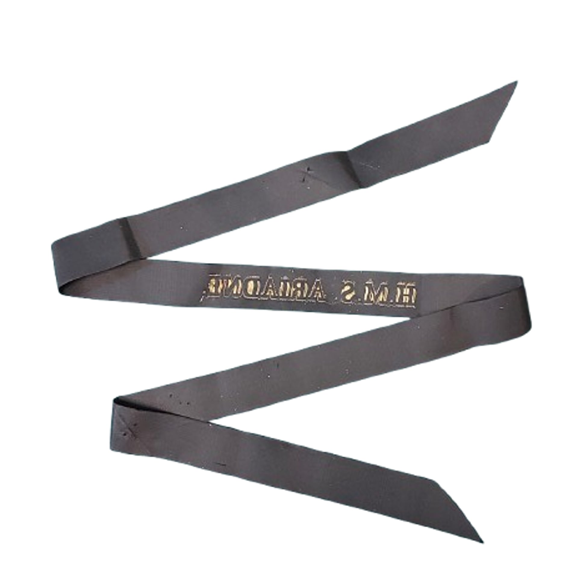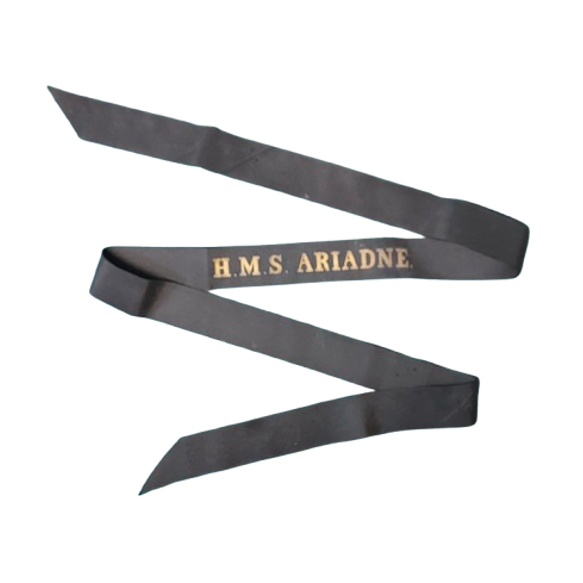 Full length British Royal Navy cap tally, full length, measuring 48 inches. The HMS Ariadne was an Abdiel-Class mine layer launched on February 16 of 1943. SKU: 63431
