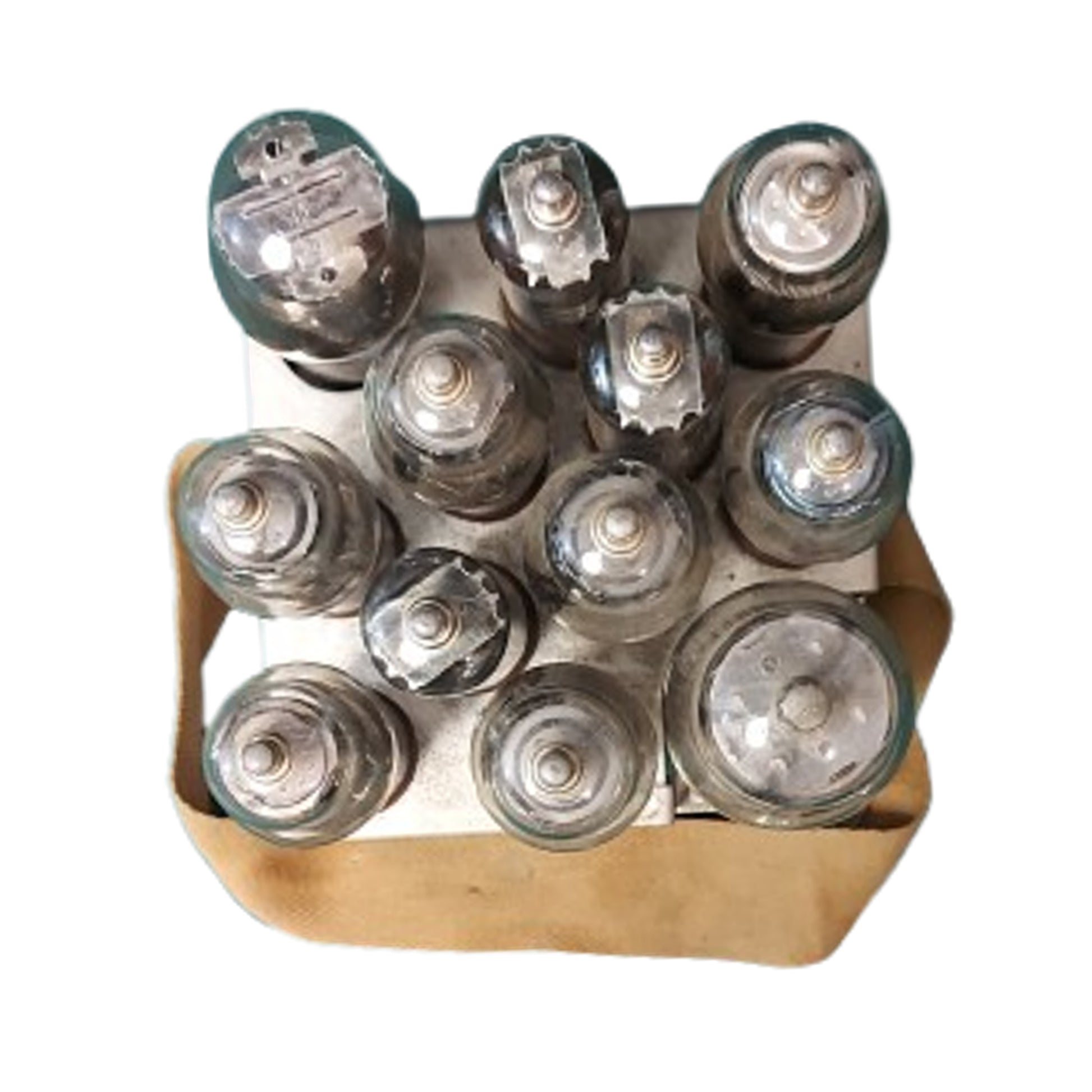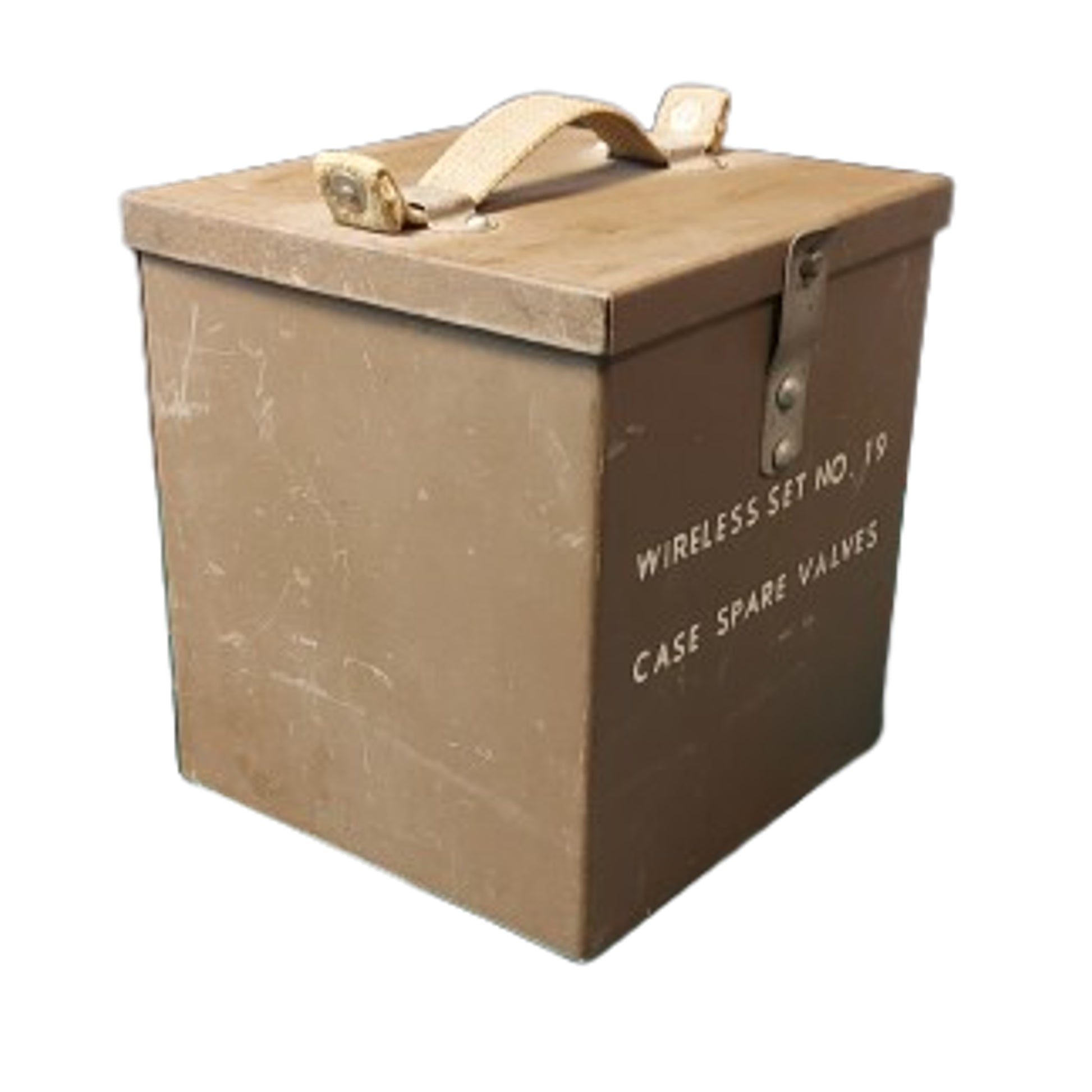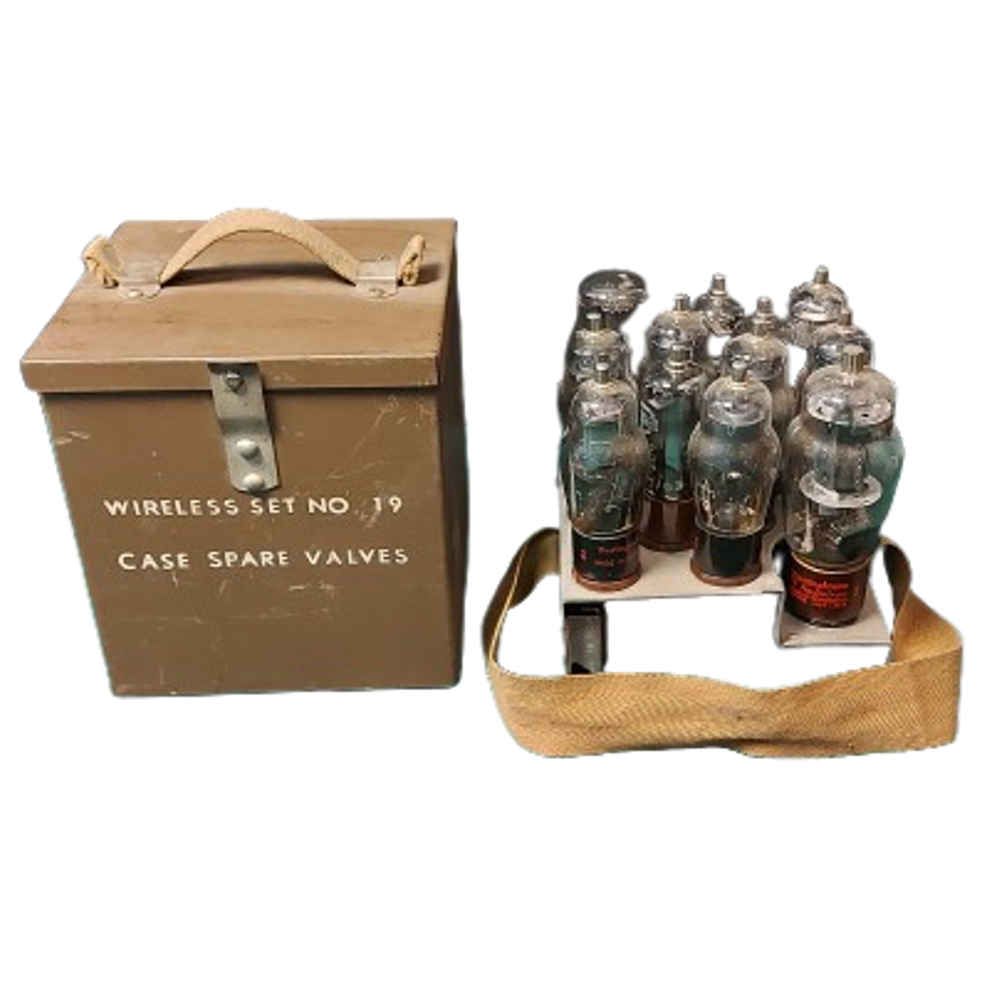Khaki color painted metal case with hinge lid measuring 6 by 6 by 7 inches with a webbed material carry strap to the top, and marked to the front, containing a lift out tray with webbed strap, and an aluminum tray with 12 vacuum tubes for use with the Canadian 19 Wireless Radio Set. All in excellent condition. Tubes have not been tested but appear to be new in condition. SKU: 63146