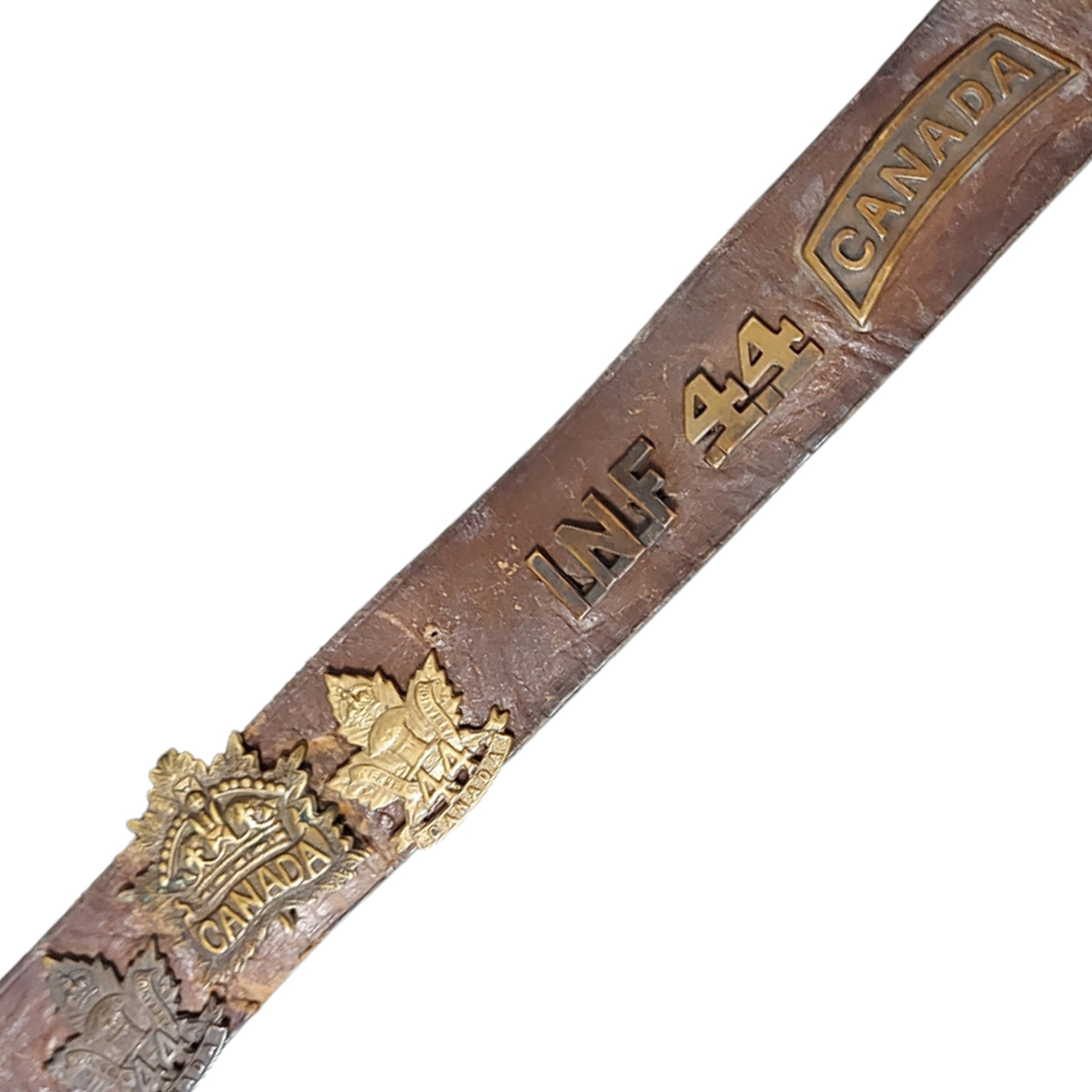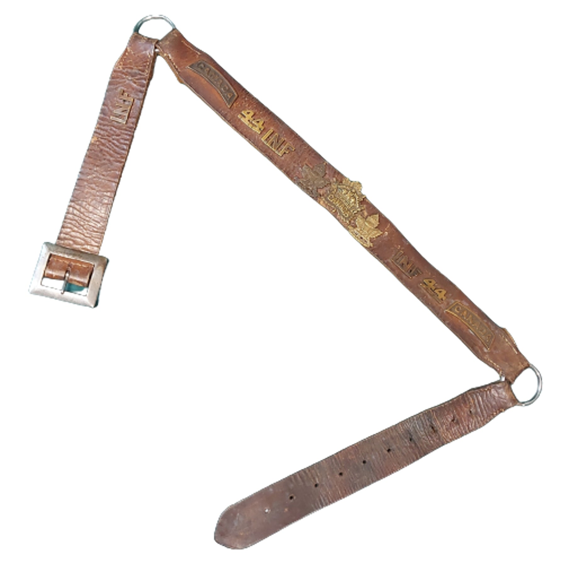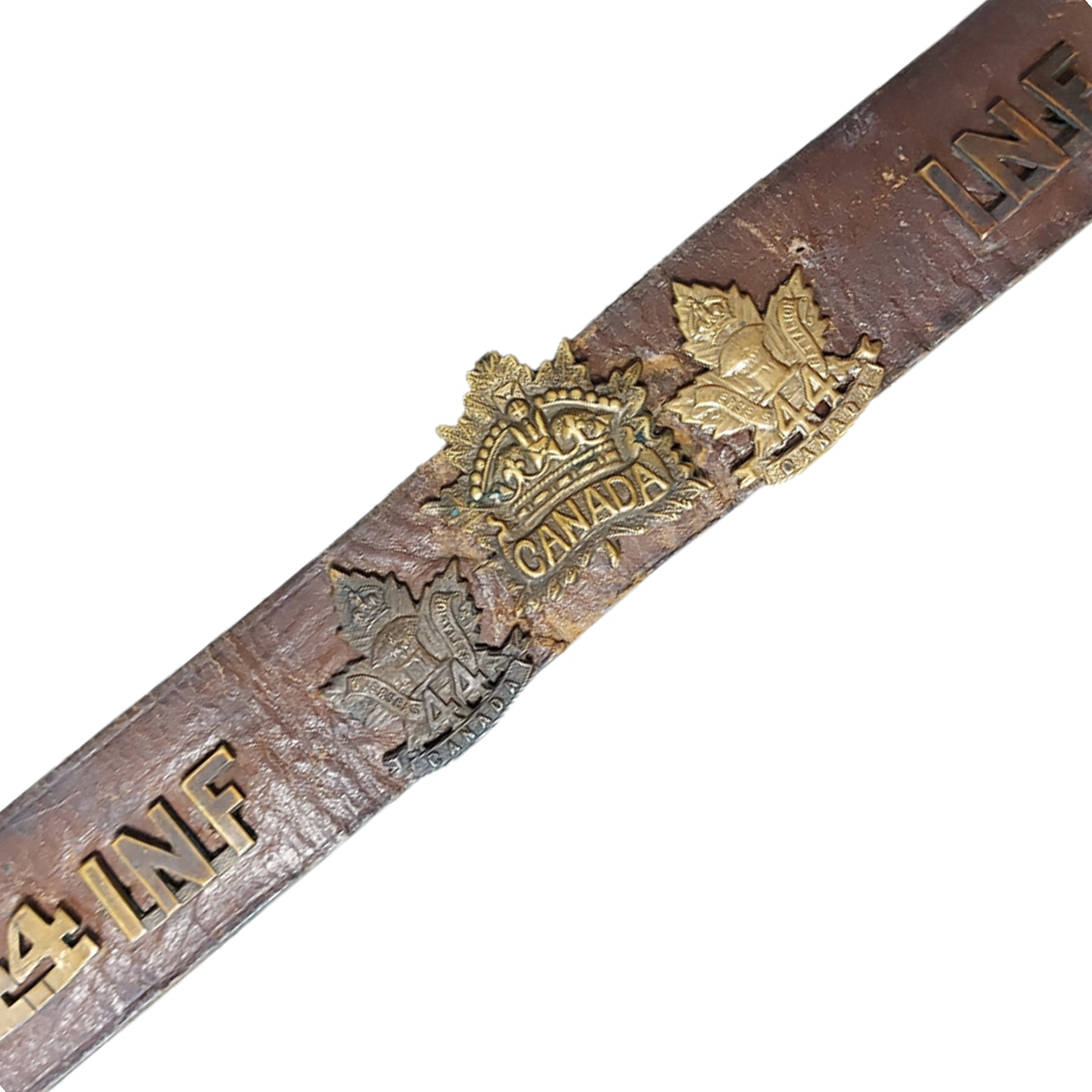 Leather belt with a white metal box buckle and 2 white metal connecting rings, measuring 38 inches in total length. General Service blackened brass cap badge to the center, flanked by 44th Battalion collar badges, 44th Battalion numbered collars, and CANADA shoulder titles to each side. A single Infantry collar badge to the outer belt section in place. A one-of-a-kind item from someone who served in the 44th Battalion.
