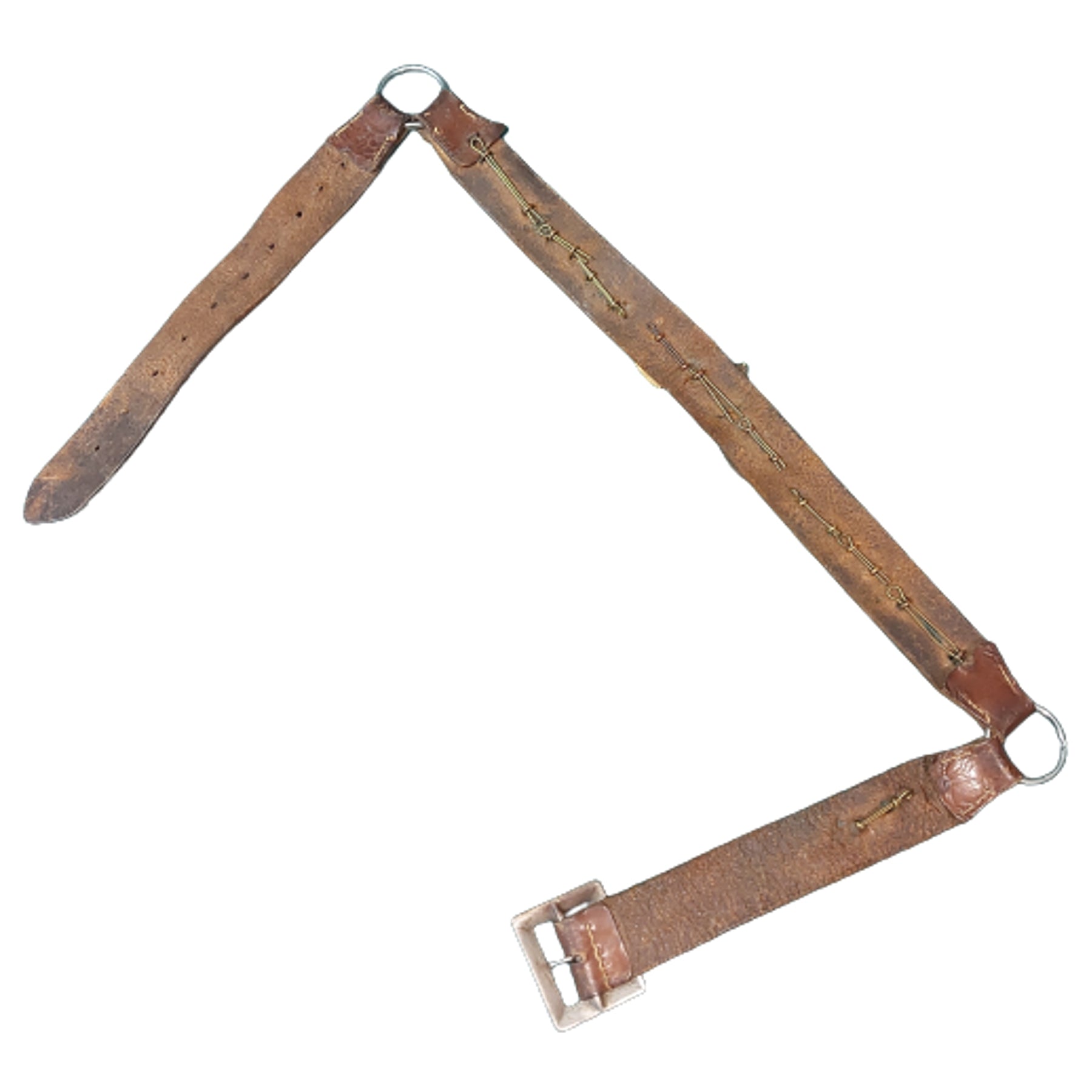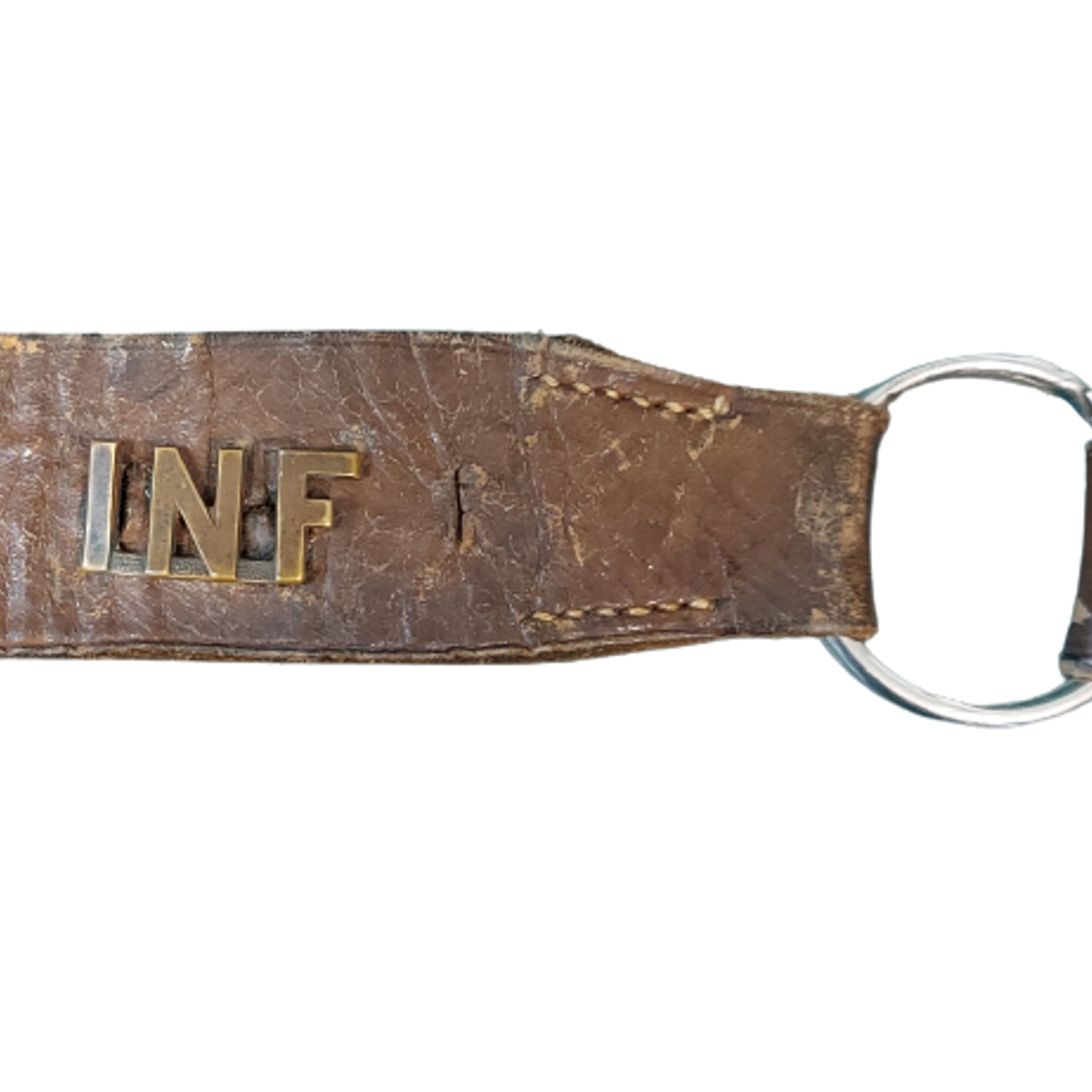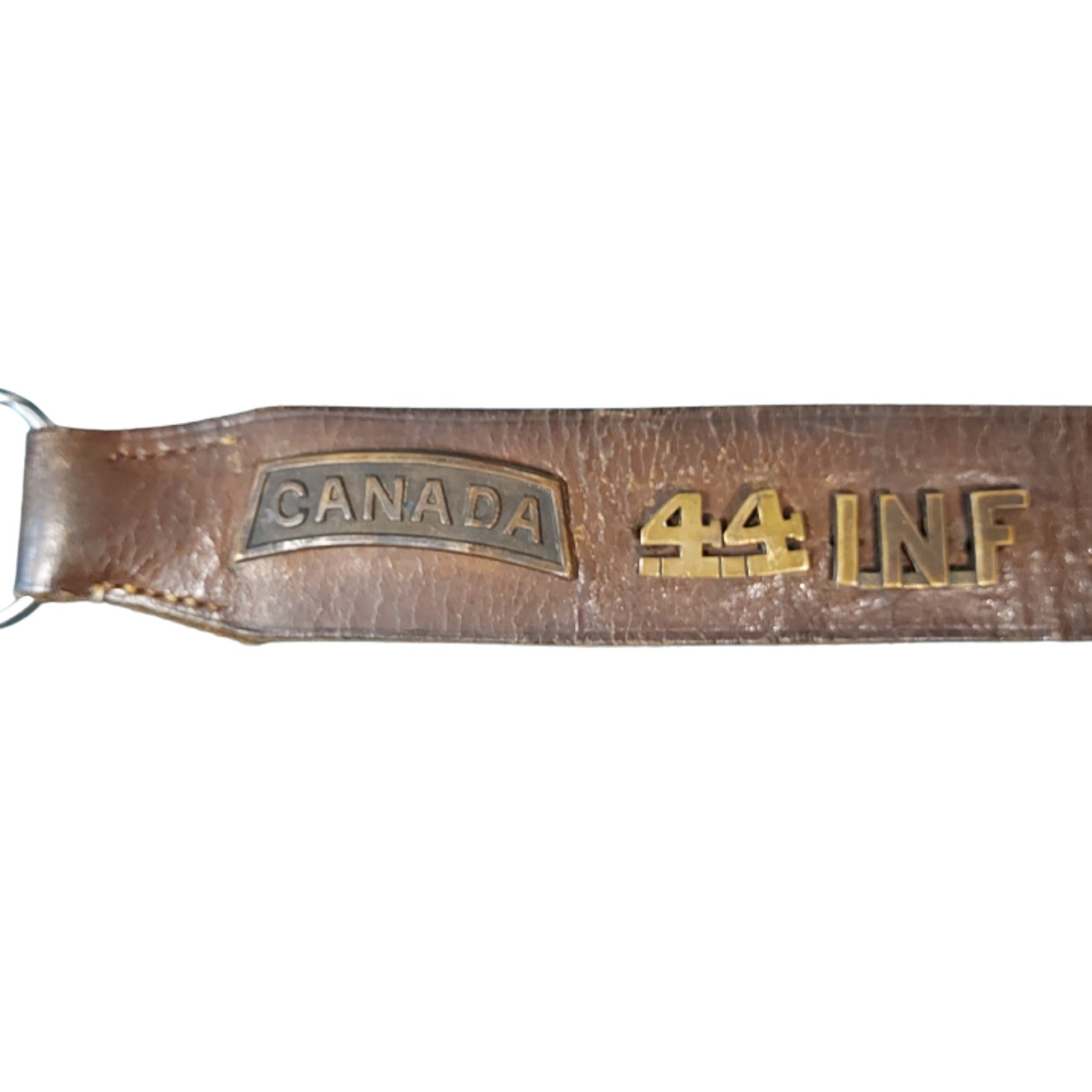 Leather belt with a white metal box buckle and 2 white metal connecting rings, measuring 38 inches in total length. General Service blackened brass cap badge to the center, flanked by 44th Battalion collar badges, 44th Battalion numbered collars, and CANADA shoulder titles to each side. A single Infantry collar badge to the outer belt section in place. A one-of-a-kind item from someone who served in the 44th Battalion.
