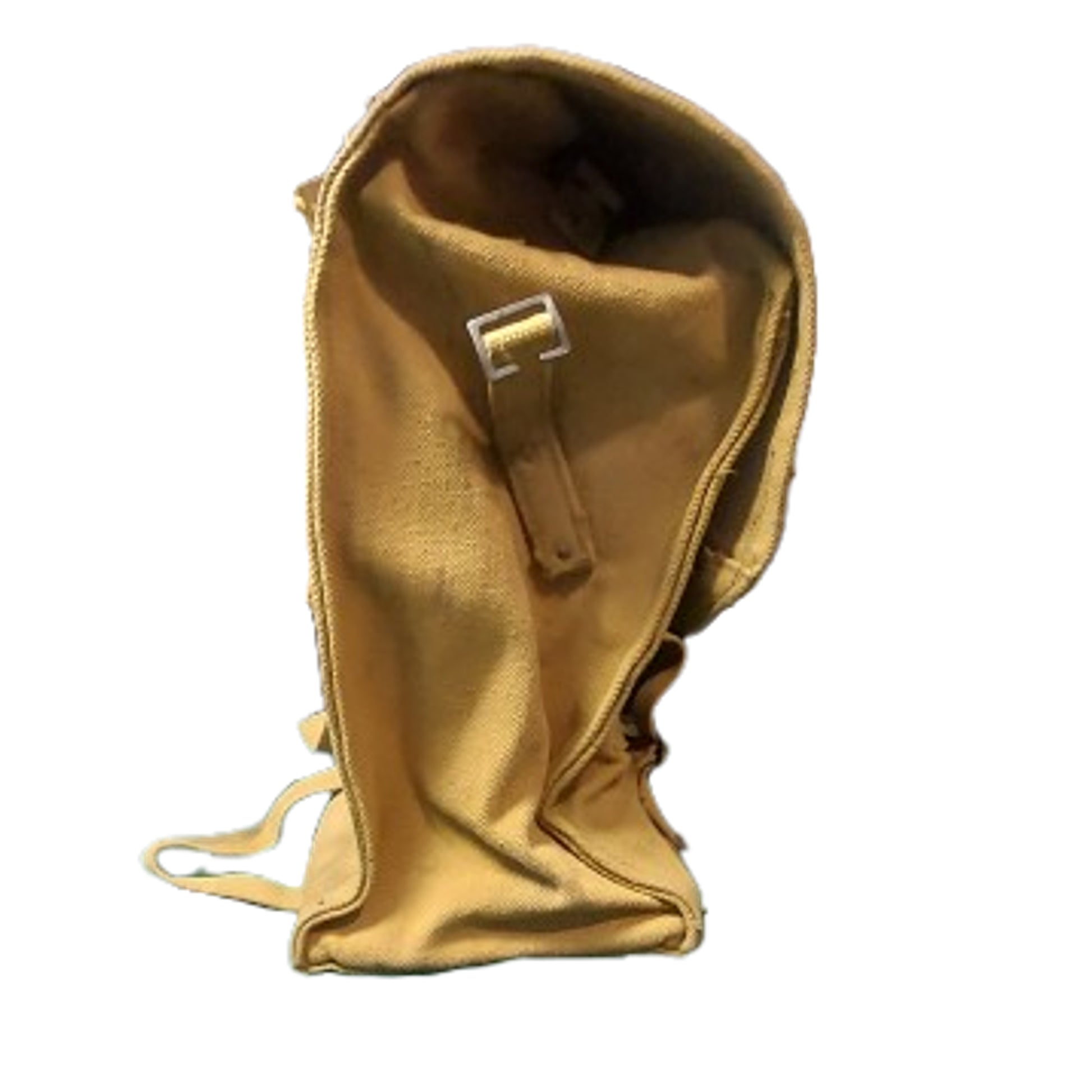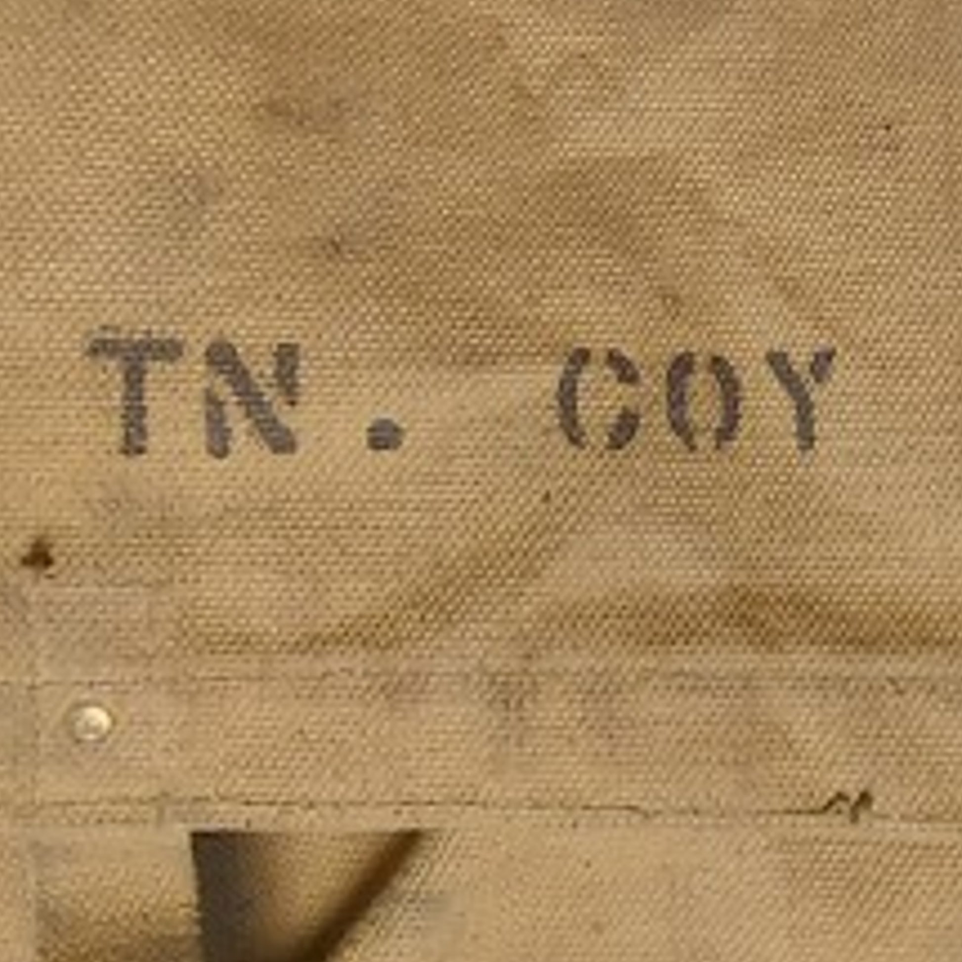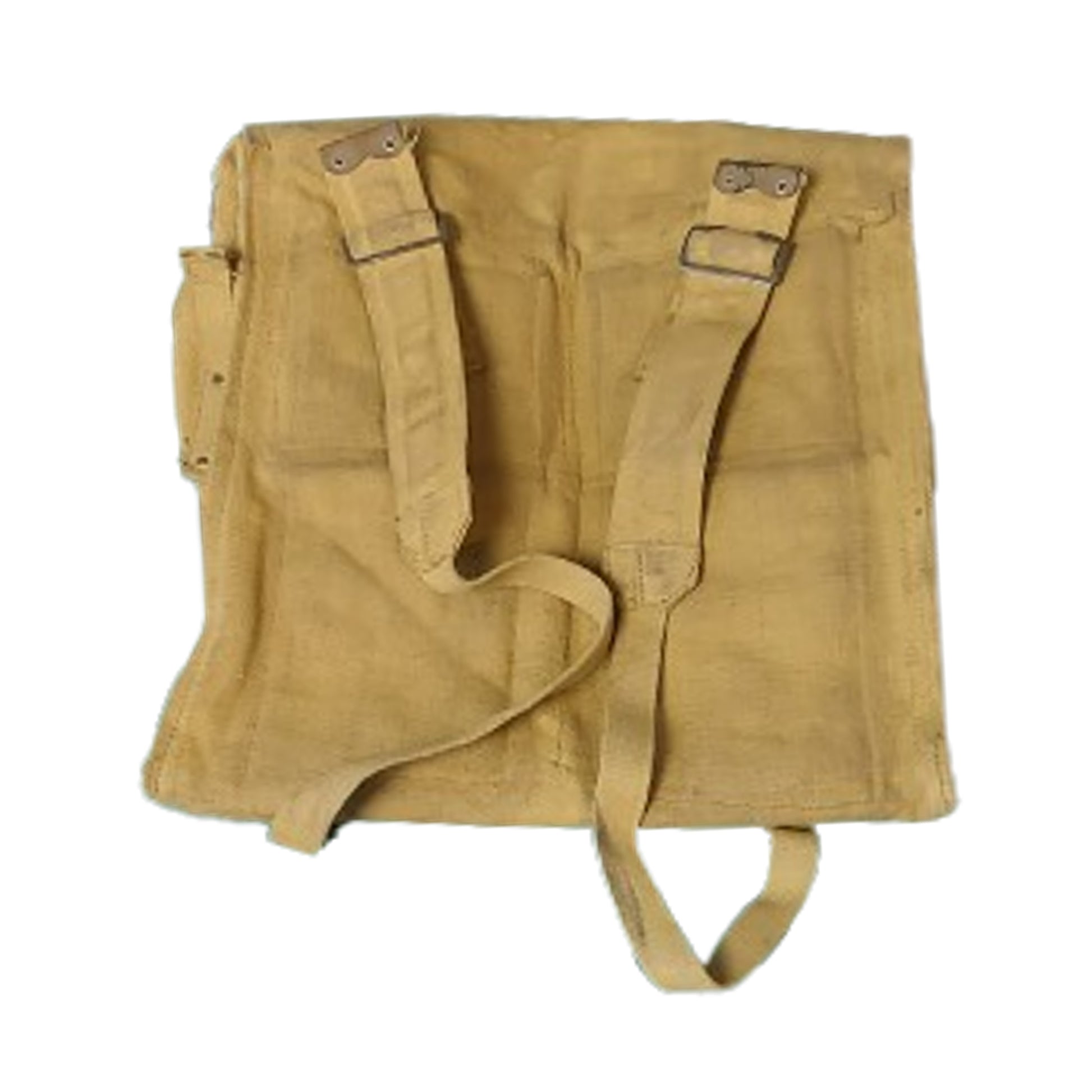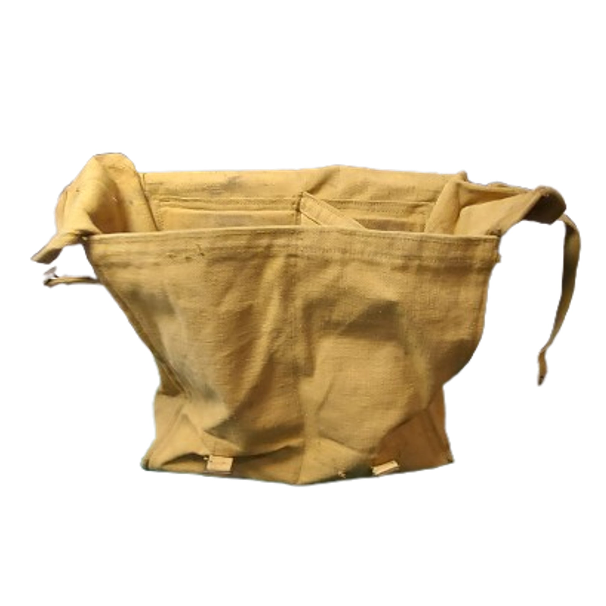 Heavy web material construction with large flap closure and 2 webbed closure straps to steel buckles. Used to contain and carry 2 large, metal, hot food thermoses for feeding troops in the field. Very faint makers mark to the interior with a Canadian C-Broadarrow. Period applied stenciling to the front to the TN Company. Complete with carry straps to the back. Measures roughly 17 inches by 17 inches in the closed position. Shows expected use and wear. SKU: 63143
