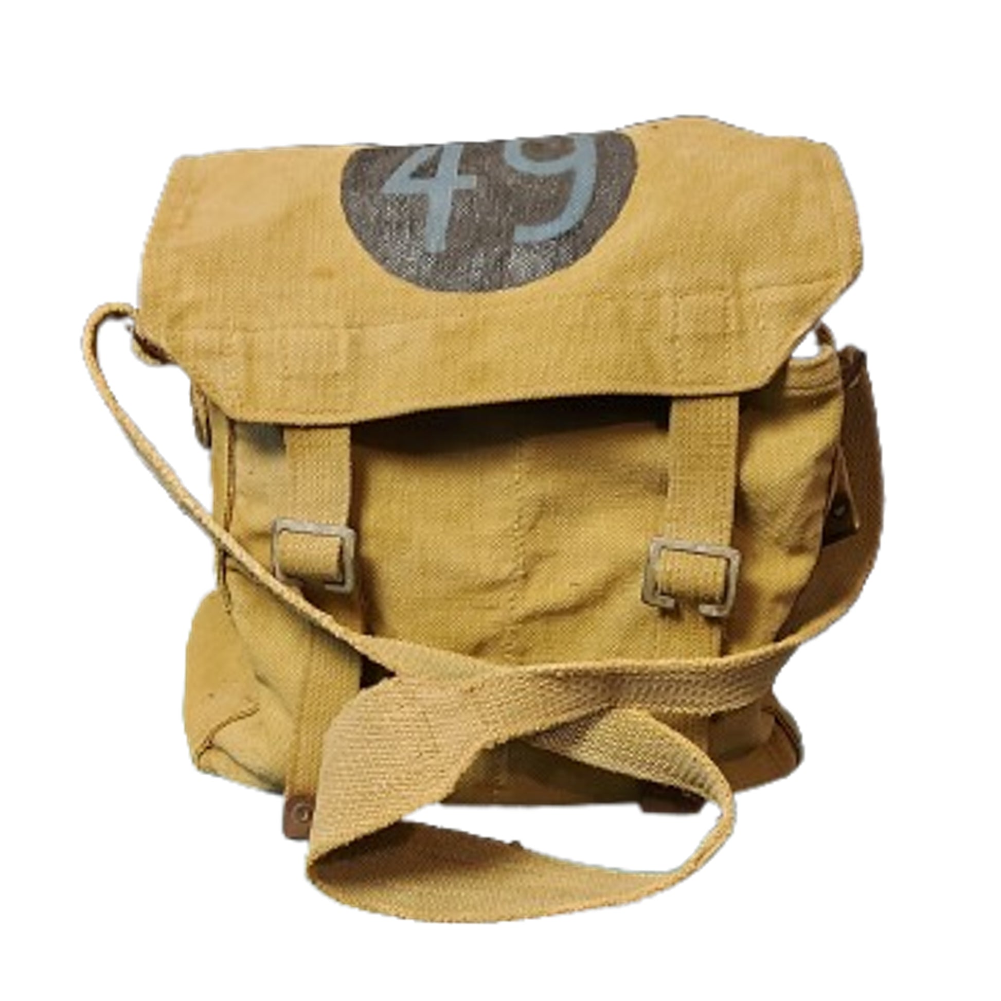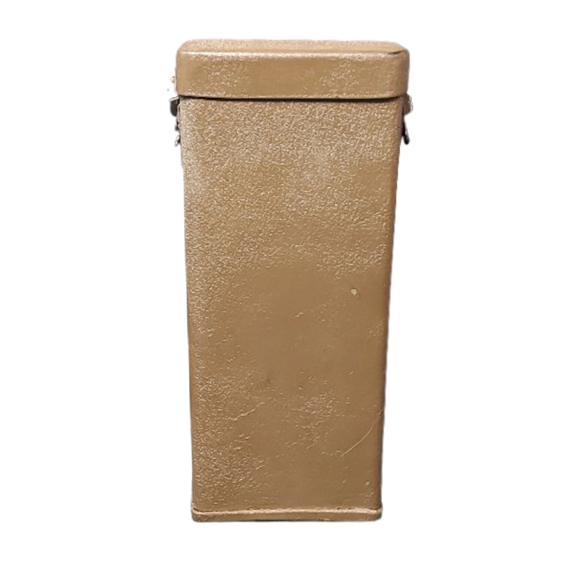WW2 Canadian Majestic Wireless Radio Set Number 27, serial number 400, with a removeable brass cap to the top covering and protecting the telescopic antenna. Manufactures label in place to the lower portion of the right side. Webbed material hand strap to the side, and a cable that connects the radio to the metal battery container that is C-Broadaarrow marked to the lid. A cotton wrapped cable runs from the battery container to the headset that has an adjustable length, webbed material cover headband, Both earphone are clearly manufacture marked. A spare metal battery container is also present. The radio unit and battery containers are housed in a manufacture marked, 1943 dated P37 webbed carrier that holds 2 spare telescopic antennas. Both the radio unit, and the webbed carrier show the same painted, hand applied 49, with the carrier having the number in a black circle in the front of the closure flap. One of hardest to find WW2 Canadian radio sets in very good original condition. SKU: 63234