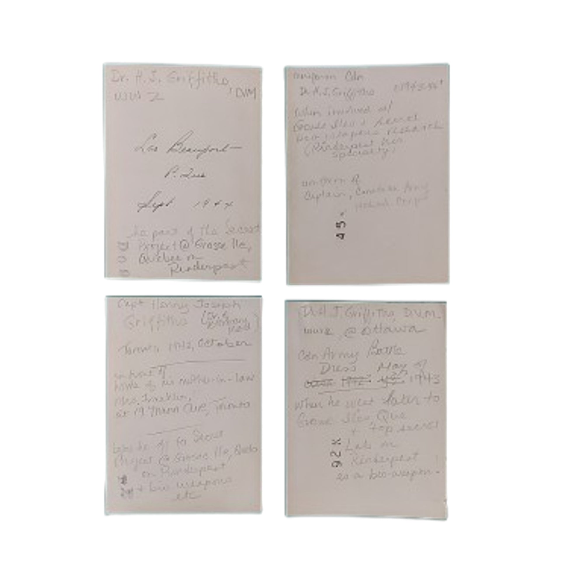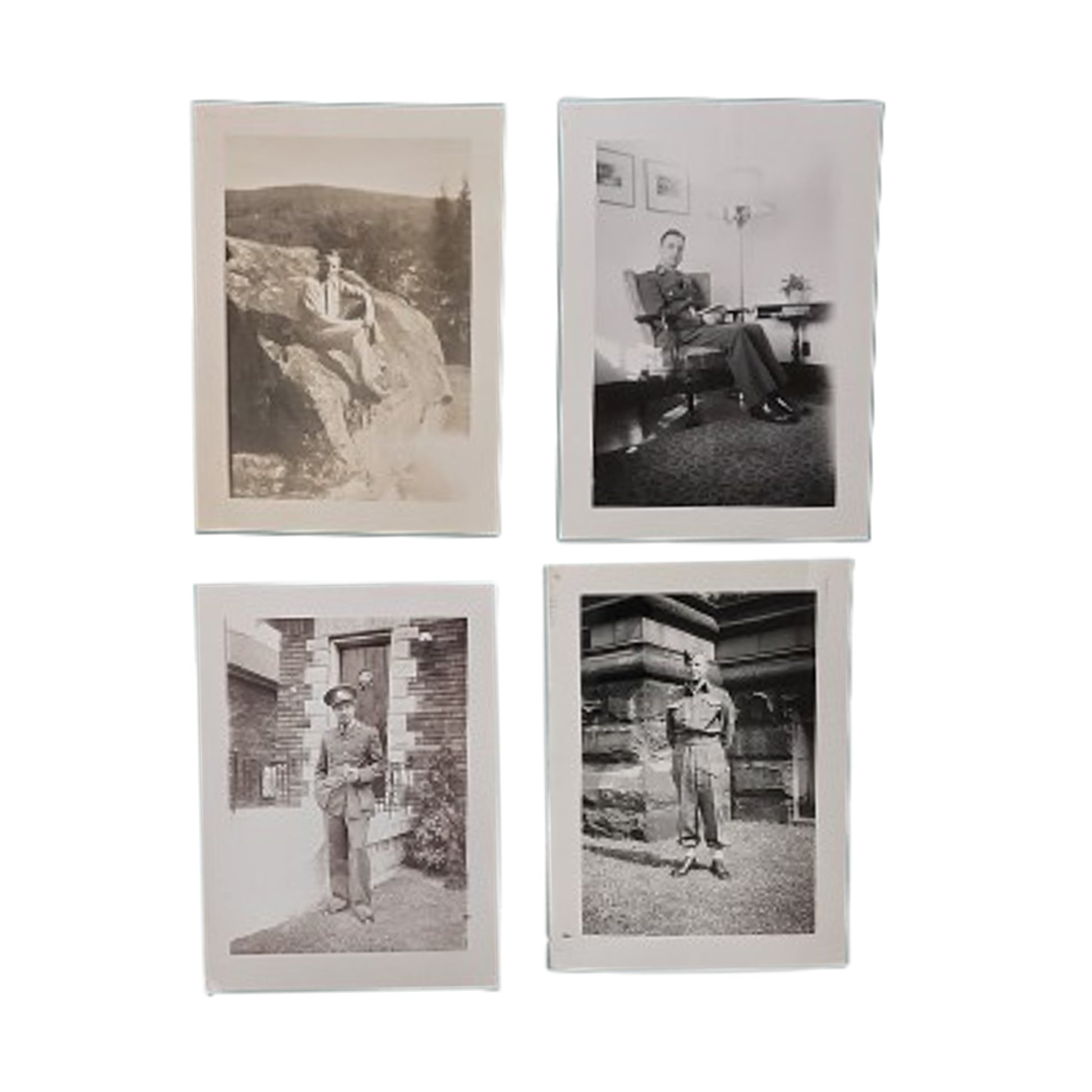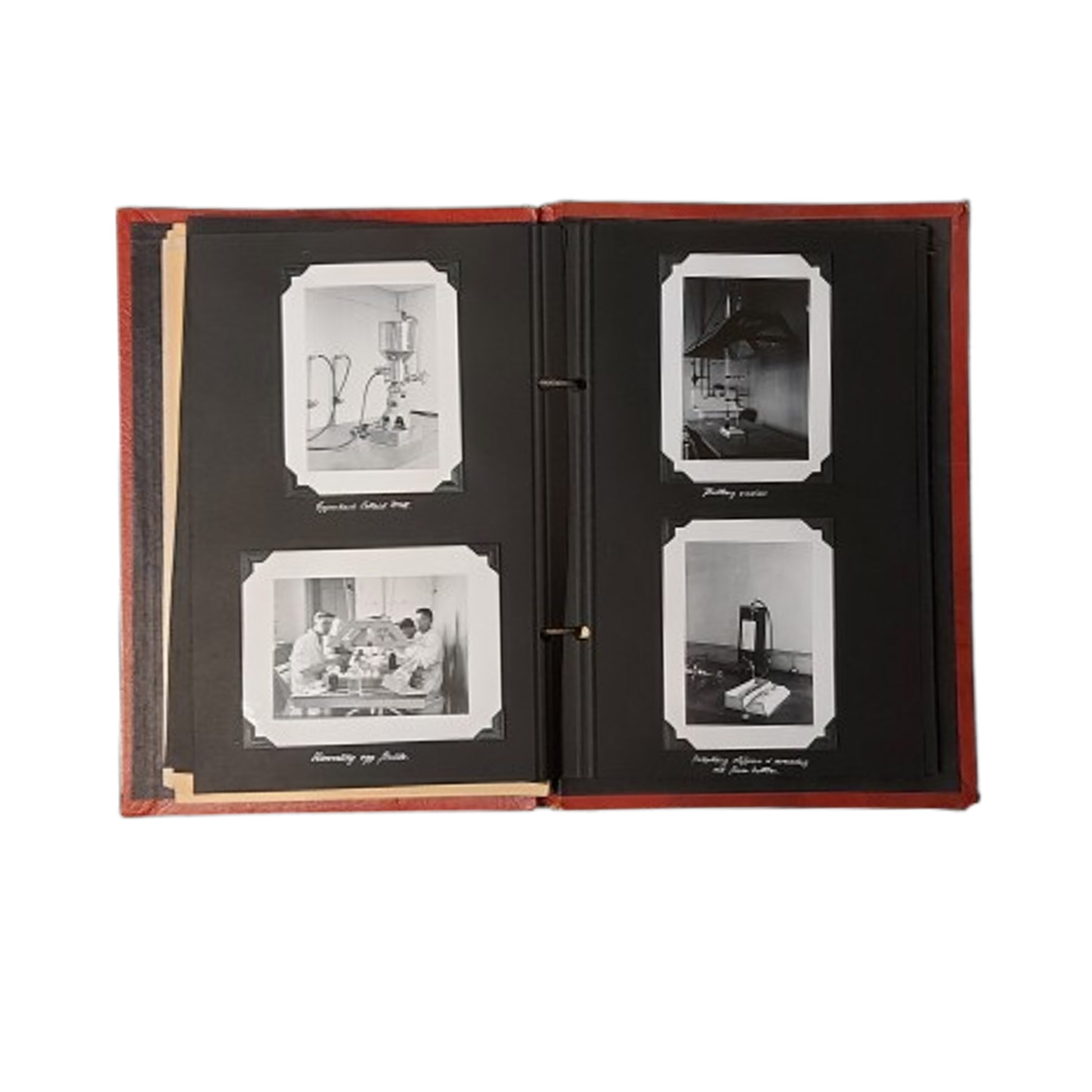 WW2 Canadian Photo Album belonging to Henry Griffiths of the War Disease Control Center. The album measures 6 3/4 by 20 inches and contains 59 WW2 and post-war black and white photos within the 62 pages that also contain caricatures with write ups and signatures of fellow soldiers and colleagues, 26 in total. The album contains 4 photos of Henry Griffiths in uniform, other soldiers an military photos, landscapes, military buildings, landmarks, and photos of the interior of the lab at the War Disease Control Center. The album is accompanied with a Spring 1896 copy pf the Veterinary Medicine publication from the College of Veterinary Medicine announcing the death of Henry Griffiths, and stating that he had volunteered for the Canadian Army in 1943, and during WW2 was stationed at a War Disease Control Center, working on rinderpest and anthrax. He was later transferred to the Canadian Army Medical Corps where he took part in anti-biological warfare investigations. He received the CVSV medal and was discharged in 1946 at the rank of Captain. A truly unique, and one of a kind photo album that was obtained directly from the family. SKU: 63257