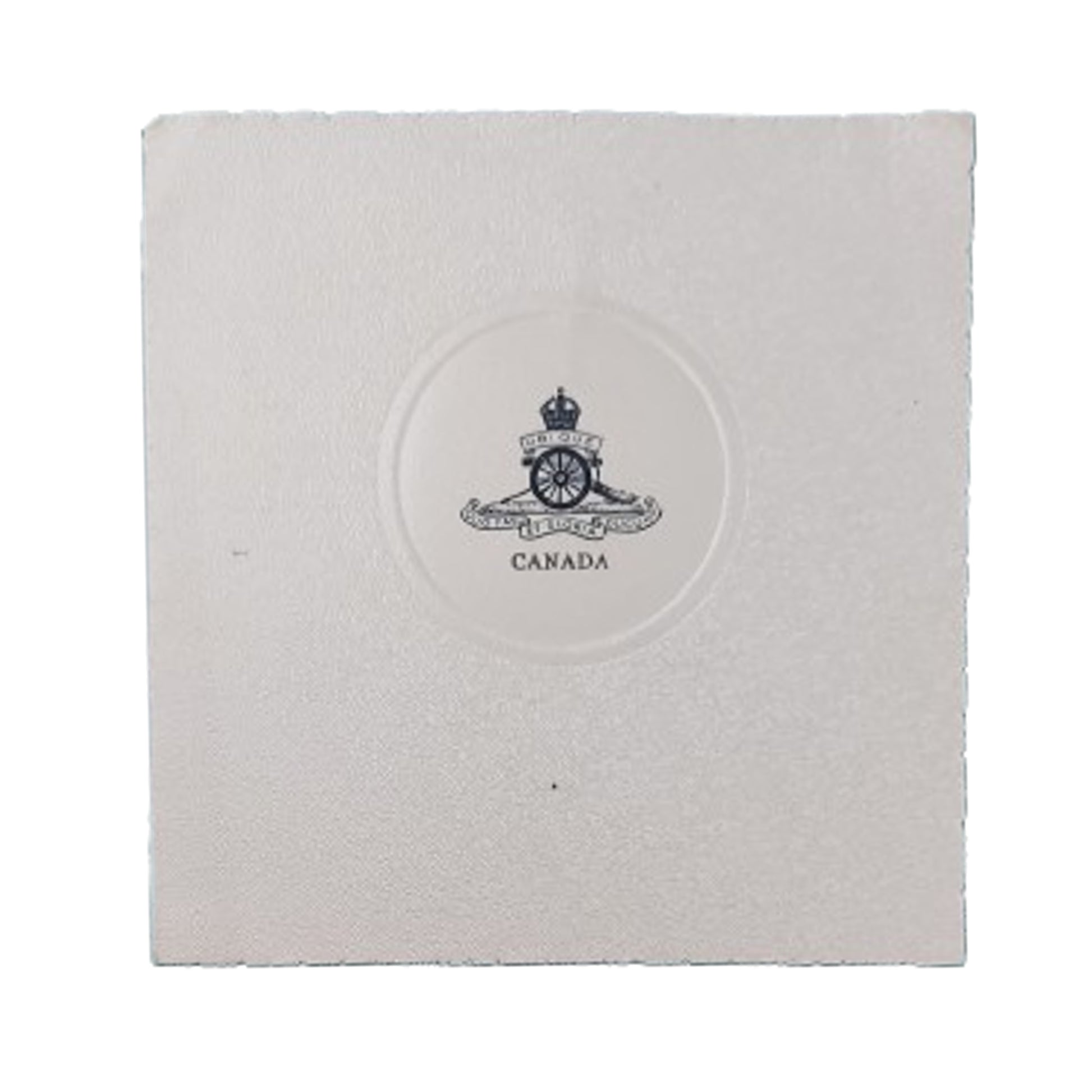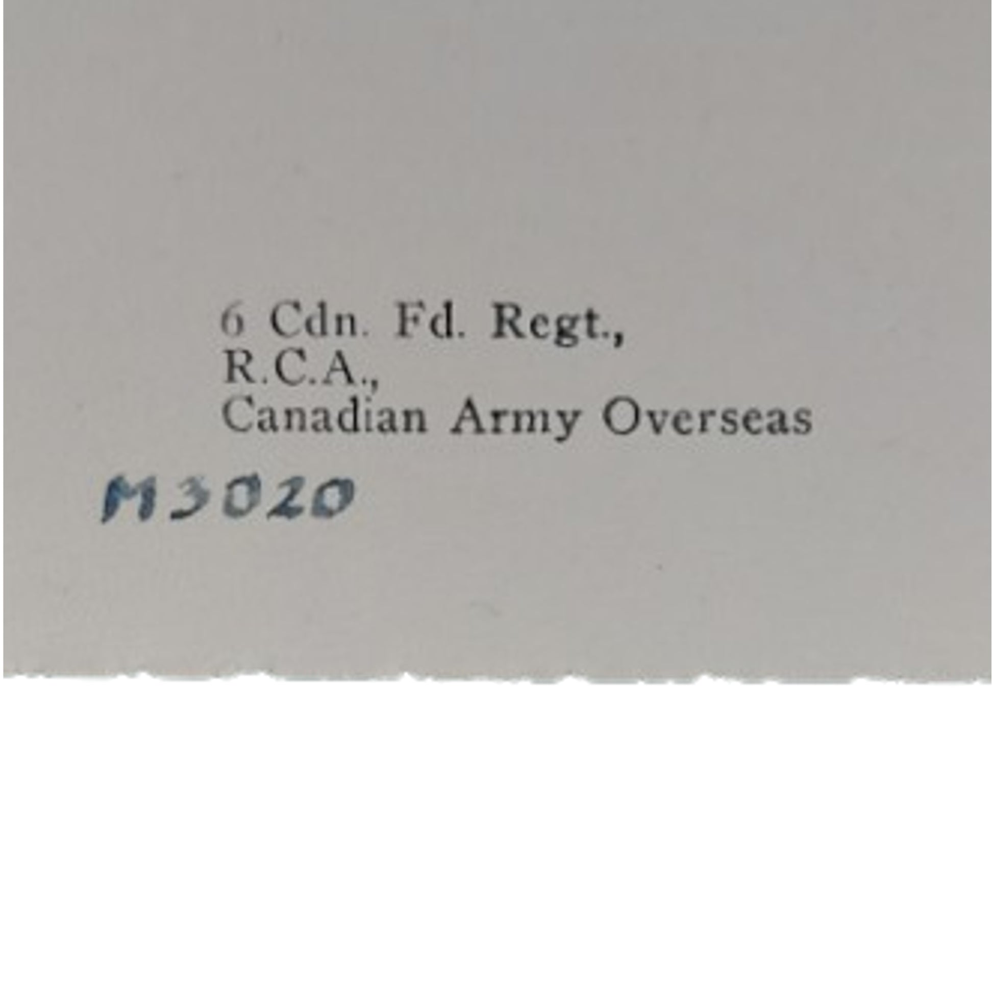 Printed on card stock, measuring 4 3/4 by 5 inches with a likeness of the RCA cap badge to the front. Dated 1941 to the interior with hand written service number M3020. Marked 6 Canadian Field Regiment, RCA, Canadian Army Overseas. SKU: 63281