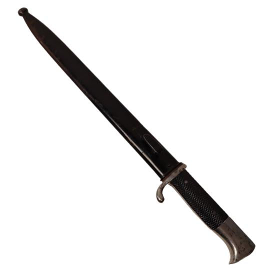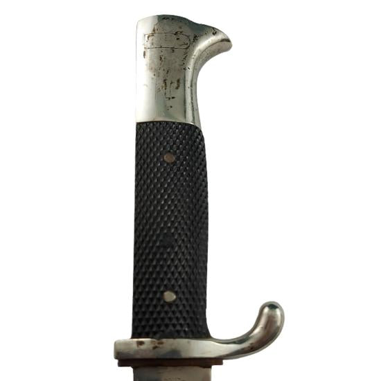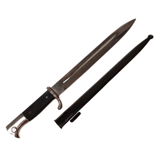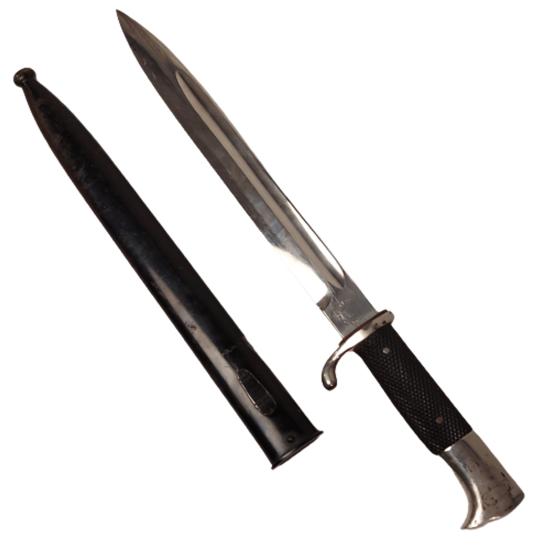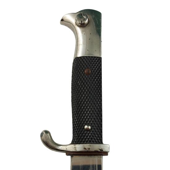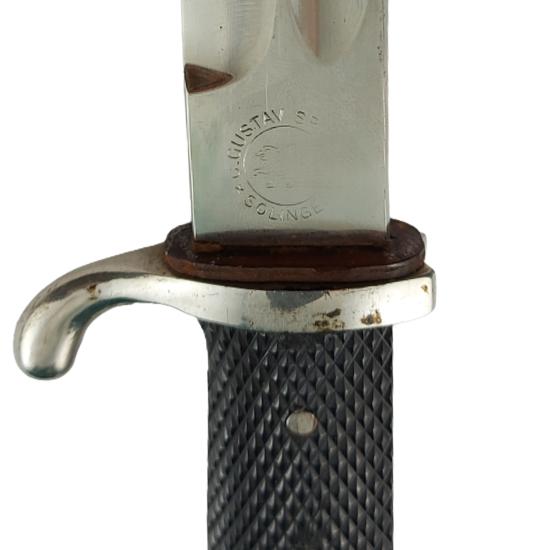 Measuring 14 1/2 inches overall with a nickel/silver single edged fuller blade that is maker marked "Gustav Stads, Solingen" Nickel/silver cross guard and eagle head pommel with a functioning release button and 2 piece ,checker, bakalite grip panels. Black, metallic scabbard in place.