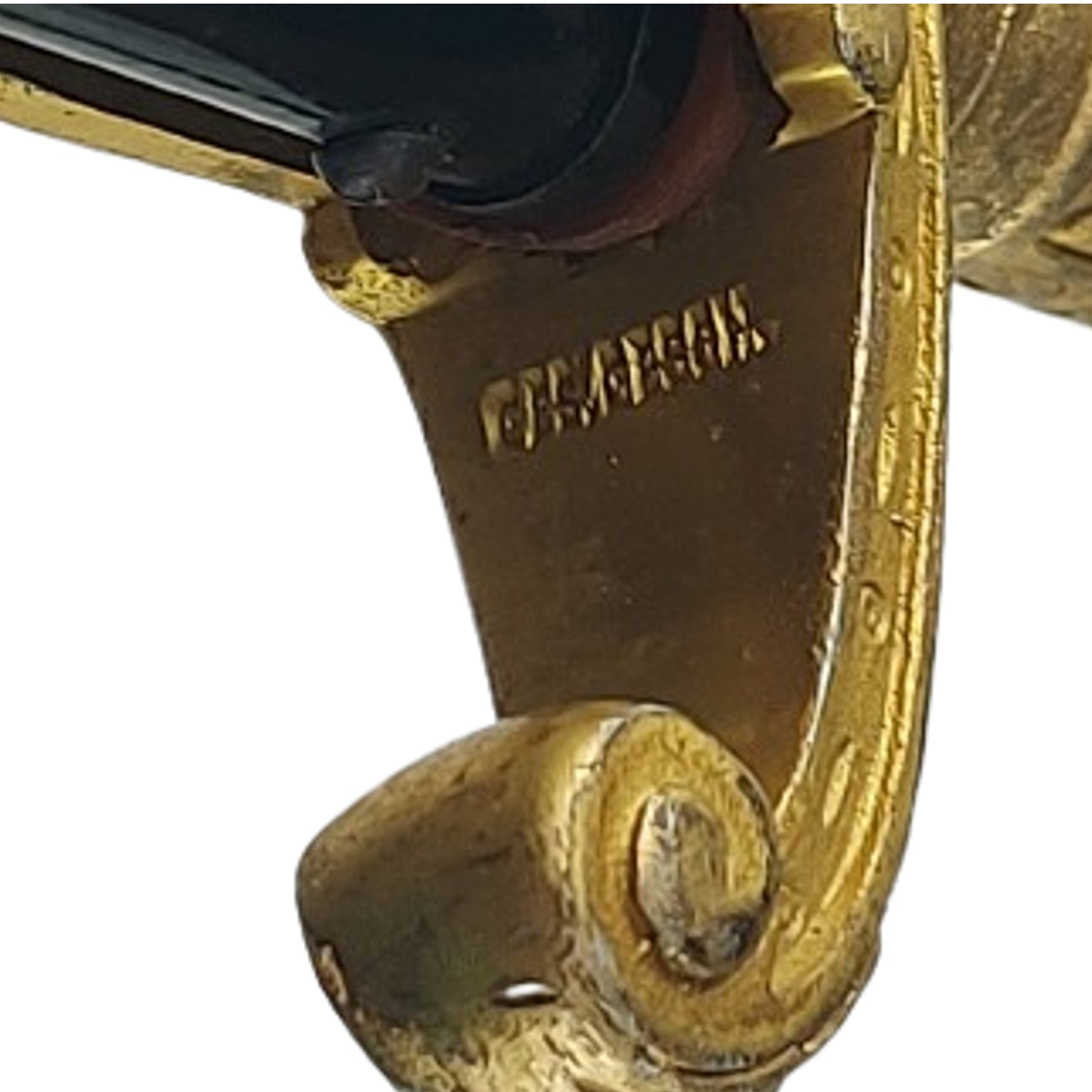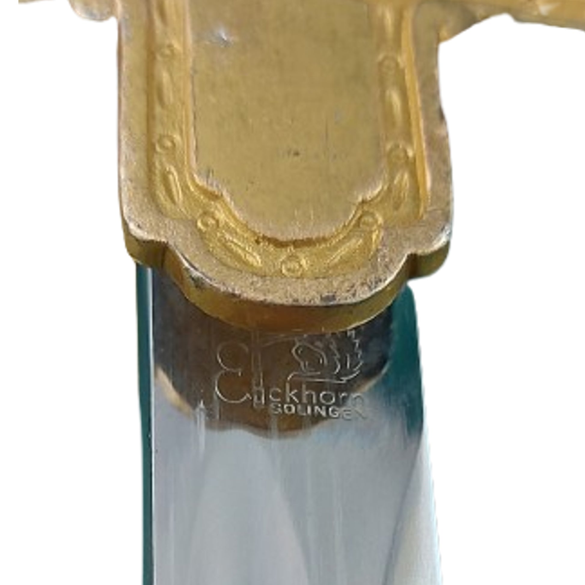 WW2 German Army Field Marshall Stein Pattern Officer's Sword, measuring 37 inches overall with a slightly curved, single edge, fullered blade that measures 33 1/2 inches in length. Maker marked Eickhorn to the one side with company logo. Gilt finish cross guard, back strap, and knuckle bow that are all nicely done with raised raised oak leaf embossing, and lower shields with the outer having the raised eagle and German Army symbol. Contoured, molded, black, bakelite grip with a central bulge, with the horizontal grooves having white metal wire wrapping. Bakalite grip is excellent with tight and bright wire wrapping, and the gilt finish being very good and full with only a few small handling marks present, and wear marks to the interior of the bow. Blade is also excellent, and also being bright and clean with only a couple very small marks showing. The japaned black metallic field scabbard with single suspension ring is very good, having approx. 80% of the finish remaining, with some expected handling marks and blemishes. SKU: 63111