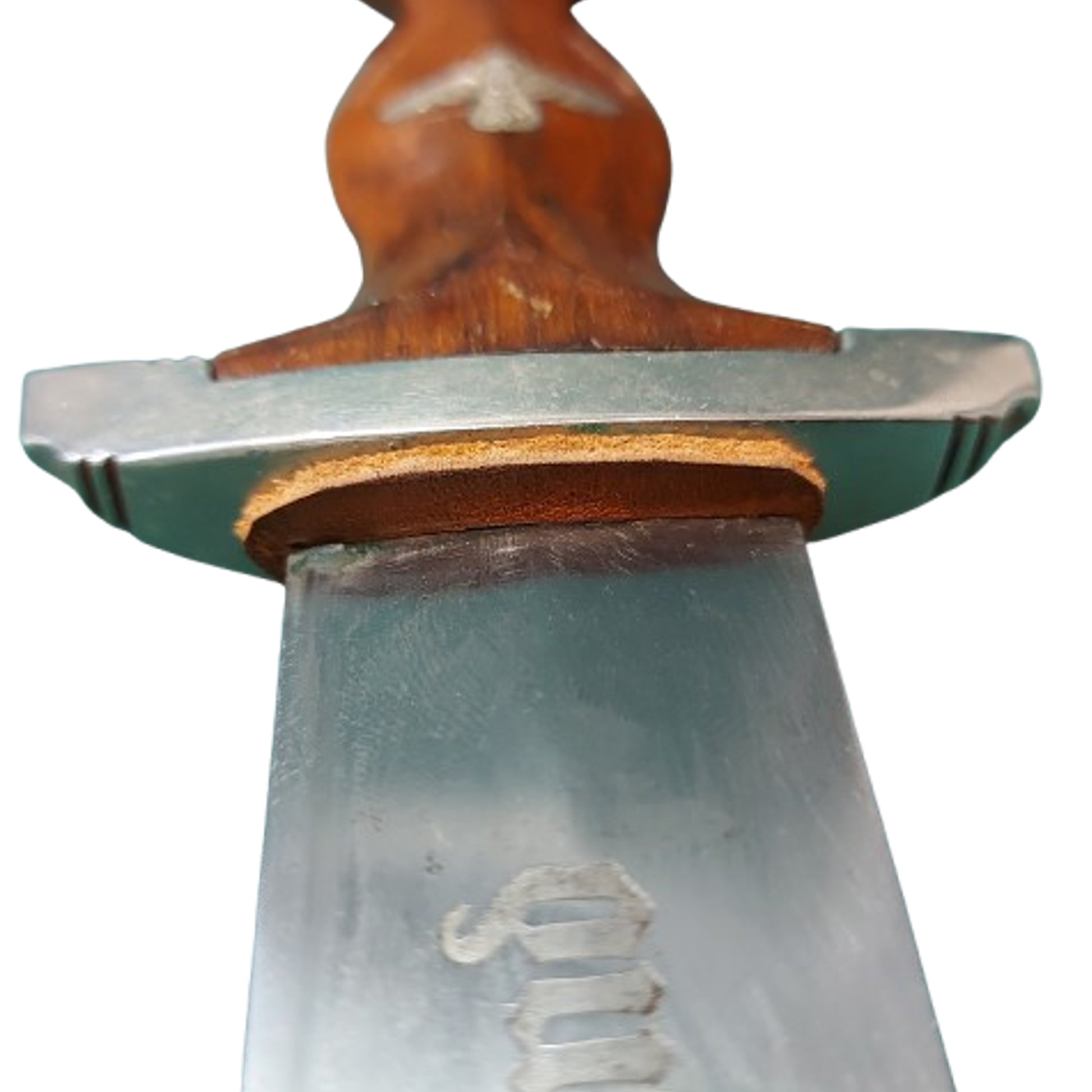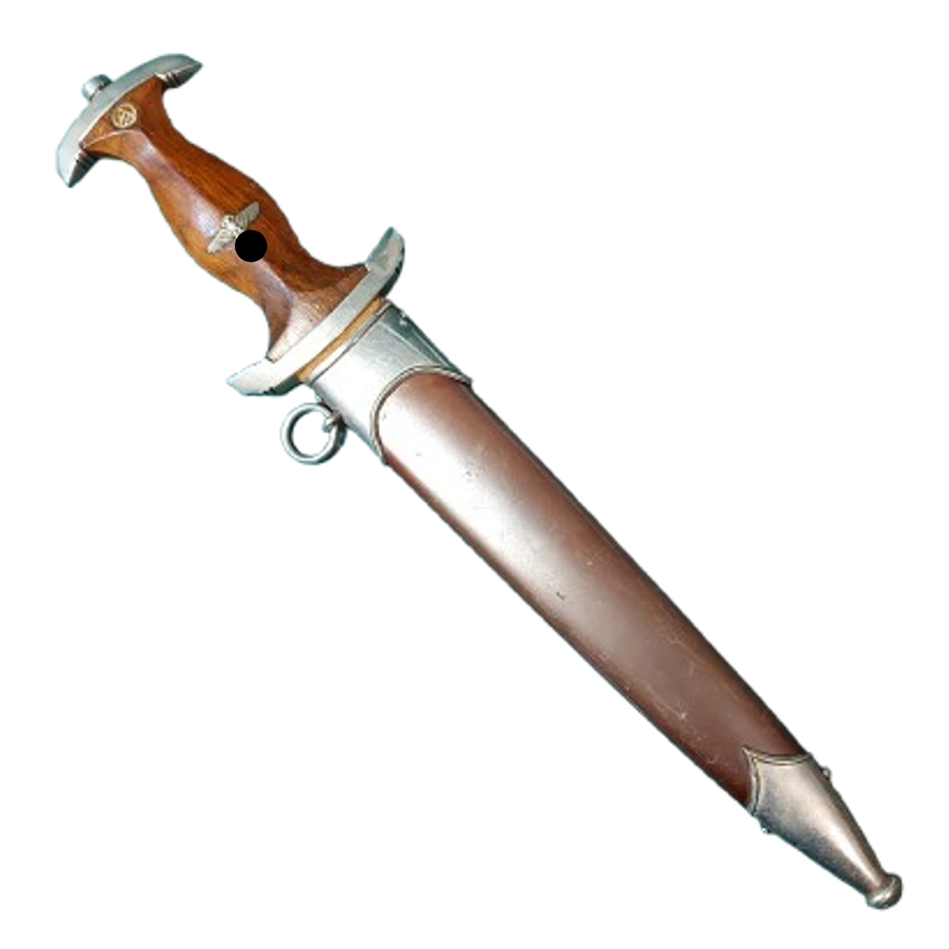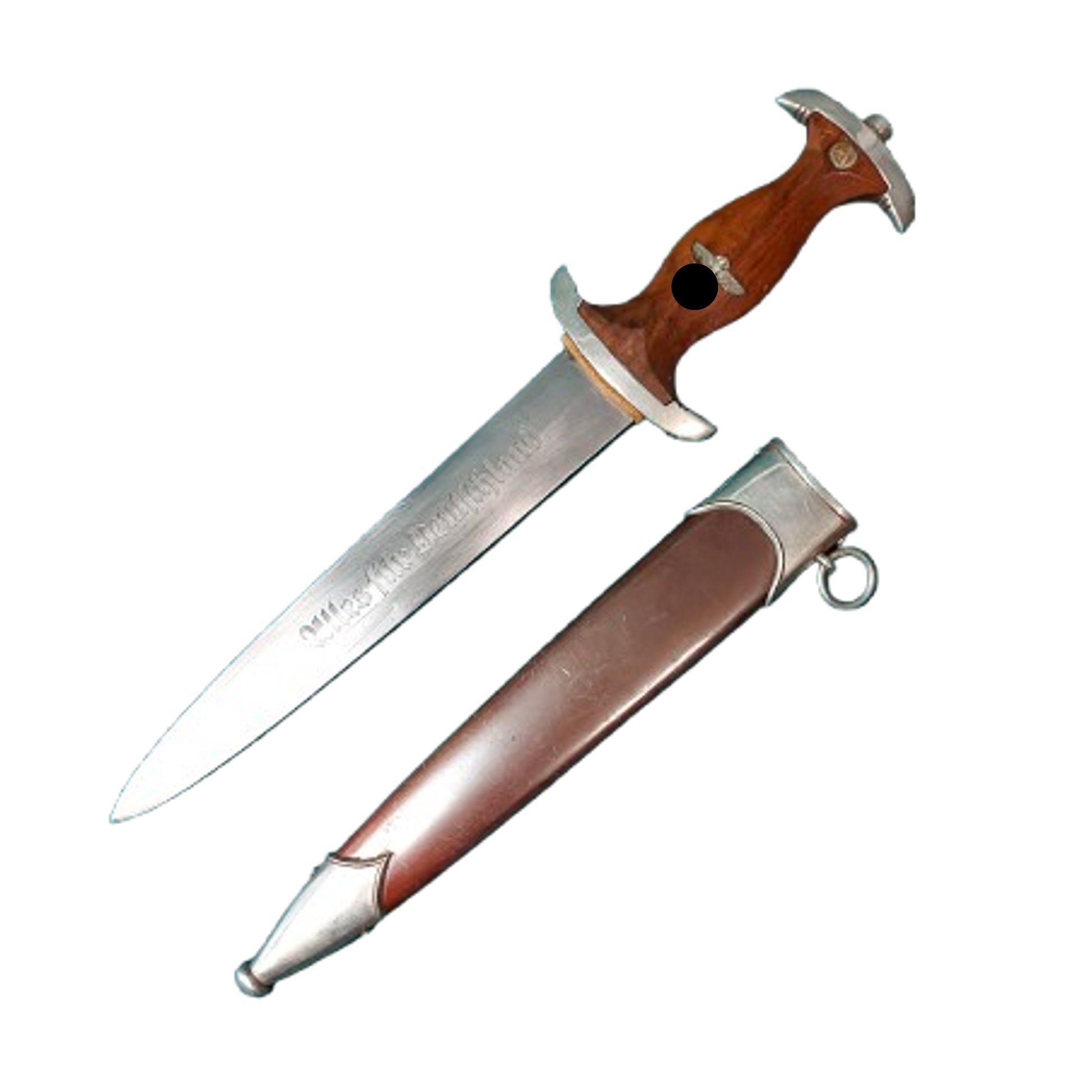 Measuring 13 1/4 inches in total length with a double edged, nickel silver plated, drop forged steel blade with a central ridge. Acid etched motto, "Alles für Deutschland", (All for Germany) to one side of the blade, and maker marked to the opposite side, Adolf Volker, Schmalkalden. Cast, nickel silver plated alloy, cross guard, pommel, and tang nut, and a one piece walnut grip with an inset eagle and symbol to the one side, with an inset SA logo above. The cross guard is group marked (used as a distribution control measure) Sa for Sachsen above the makers mark. The dagger is complete with its original brown painted metallic sheet metal scabbard with nickel silver plated fittings and a single suspension ring. The scabbard fits tightly to the dagger as it should. The blade some drag marks as to be expected with some very light and minor spotting and discoloration present. Leather washer may be a replacement. The scabbard is in very nice condition showing light wear as to be expected. SKU: 63417