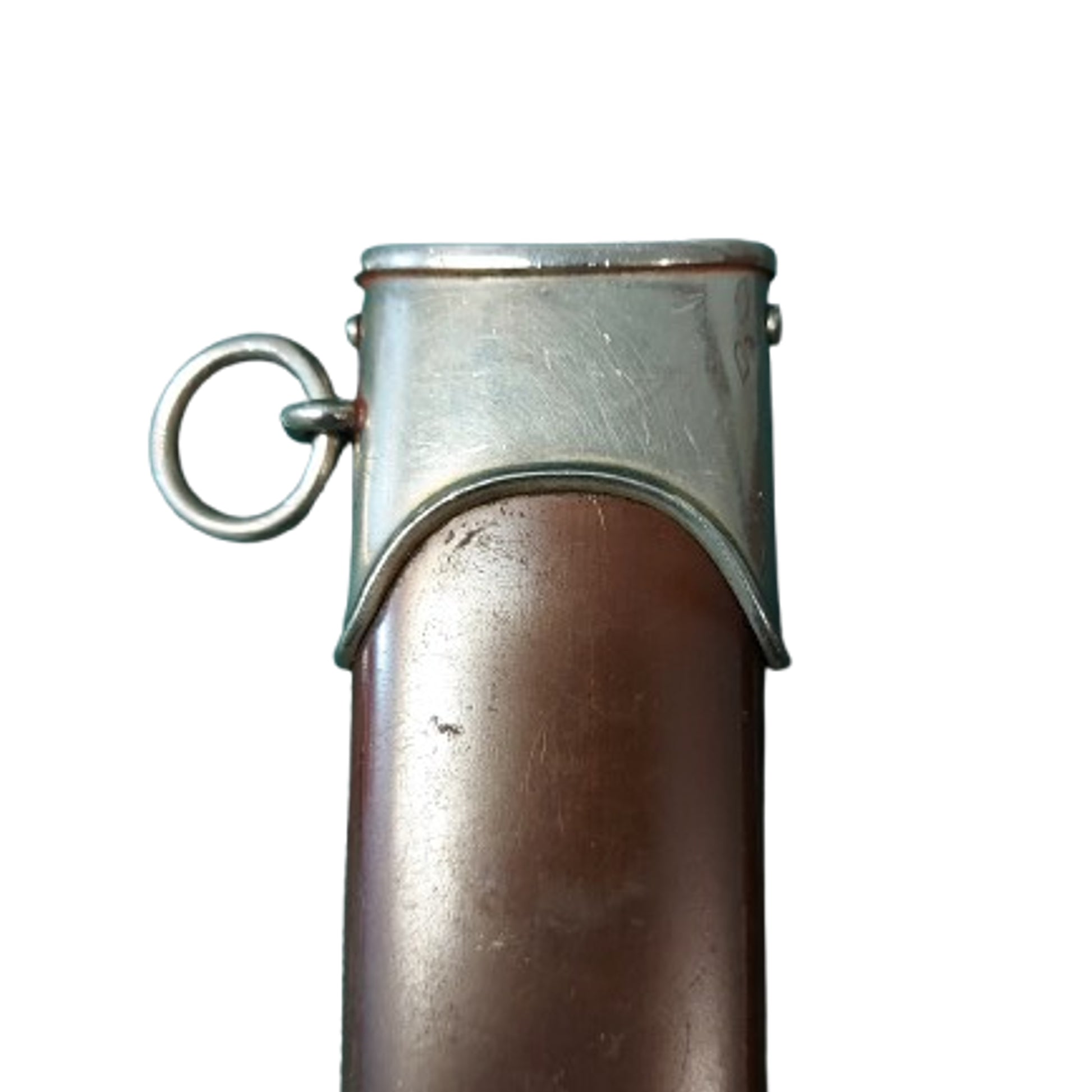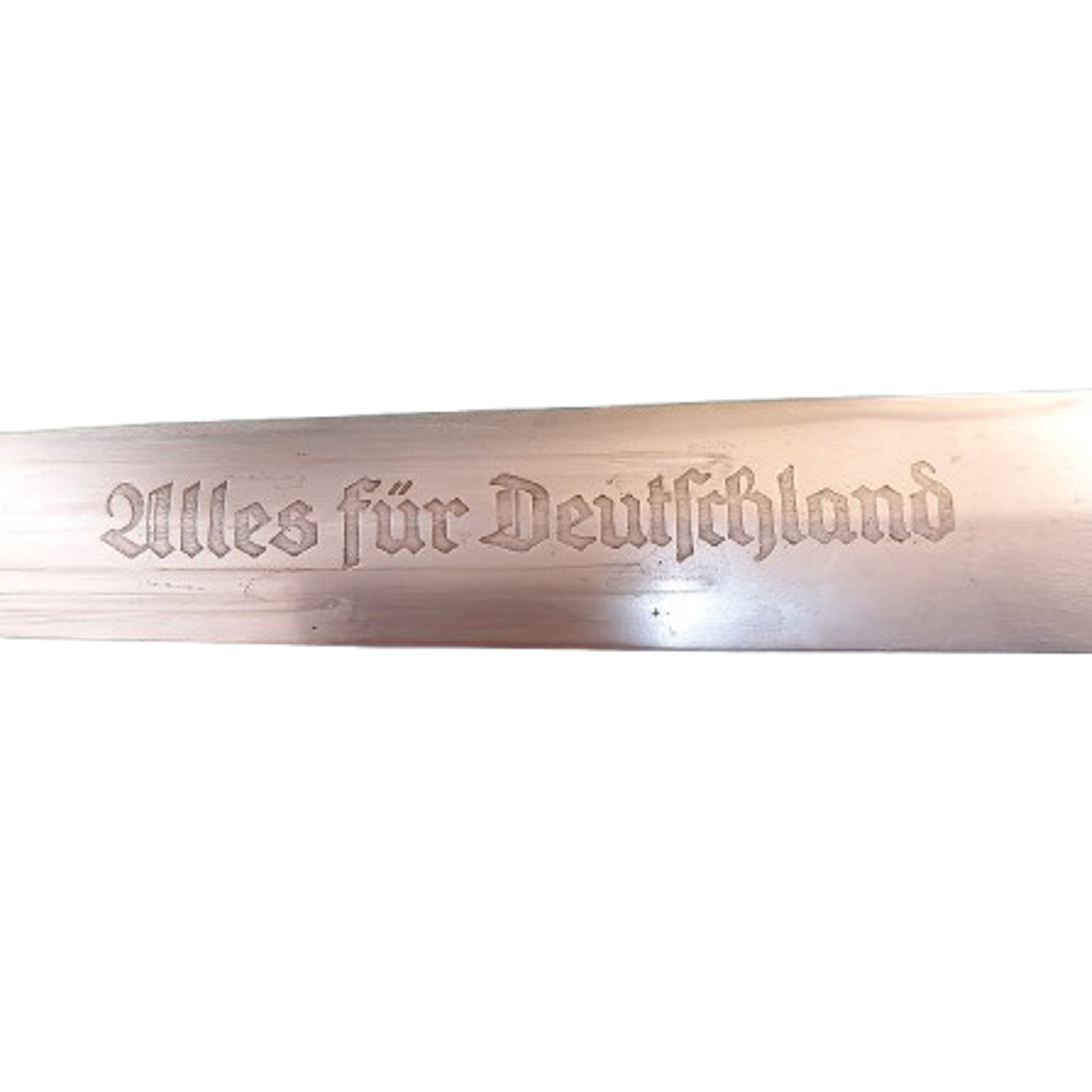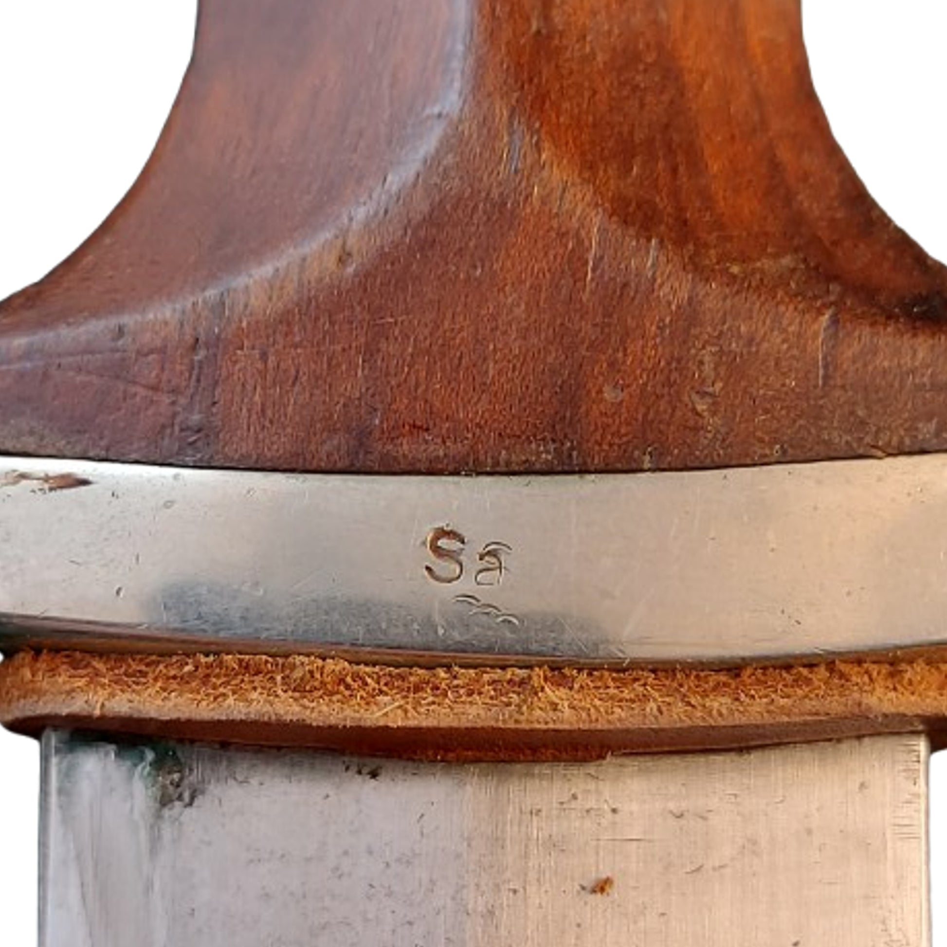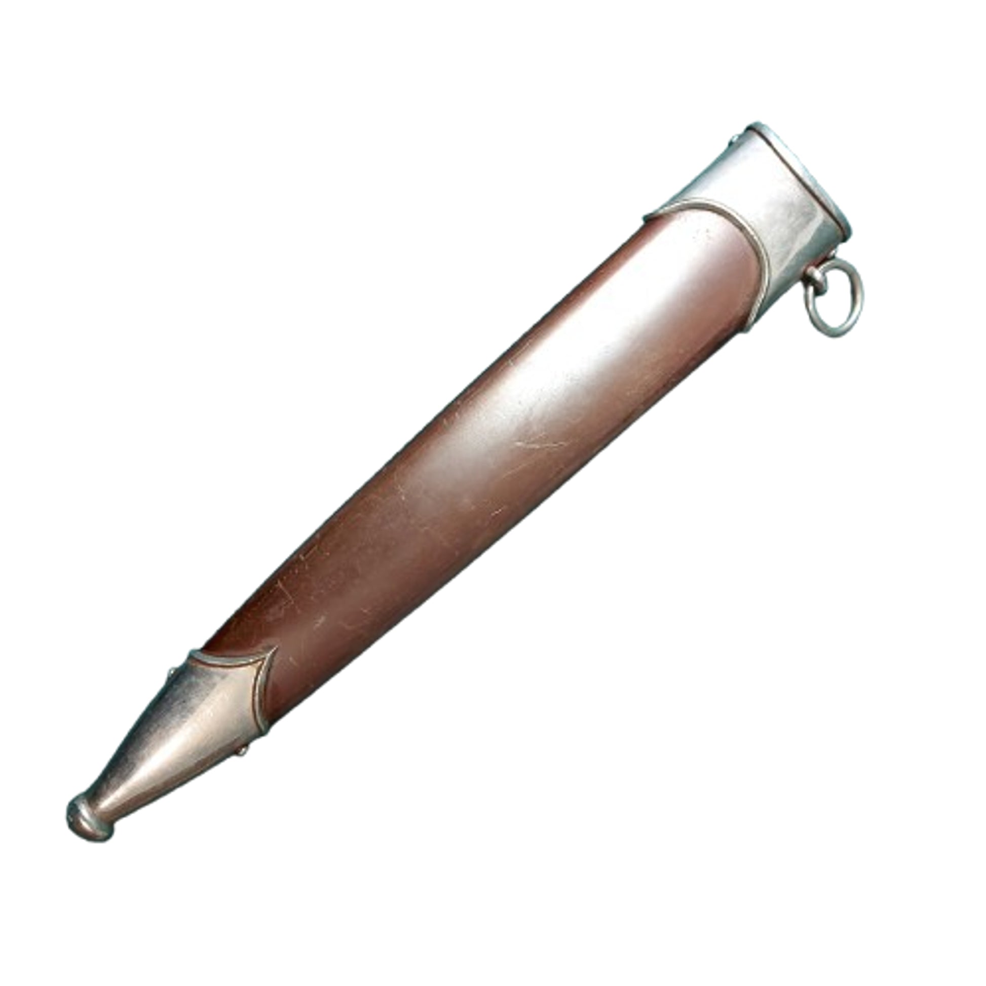 Measuring 13 1/4 inches in total length with a double edged, nickel silver plated, drop forged steel blade with a central ridge. Acid etched motto, "Alles für Deutschland", (All for Germany) to one side of the blade, and maker marked to the opposite side, Adolf Volker, Schmalkalden. Cast, nickel silver plated alloy, cross guard, pommel, and tang nut, and a one piece walnut grip with an inset eagle and symbol to the one side, with an inset SA logo above. The cross guard is group marked (used as a distribution control measure) Sa for Sachsen above the makers mark. The dagger is complete with its original brown painted metallic sheet metal scabbard with nickel silver plated fittings and a single suspension ring. The scabbard fits tightly to the dagger as it should. The blade some drag marks as to be expected with some very light and minor spotting and discoloration present. Leather washer may be a replacement. The scabbard is in very nice condition showing light wear as to be expected. SKU: 63417