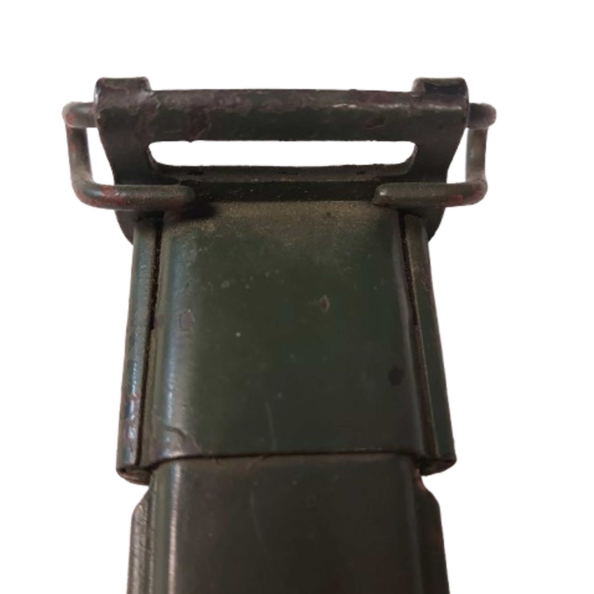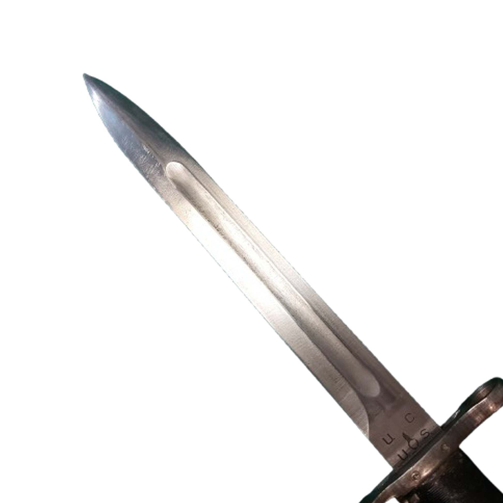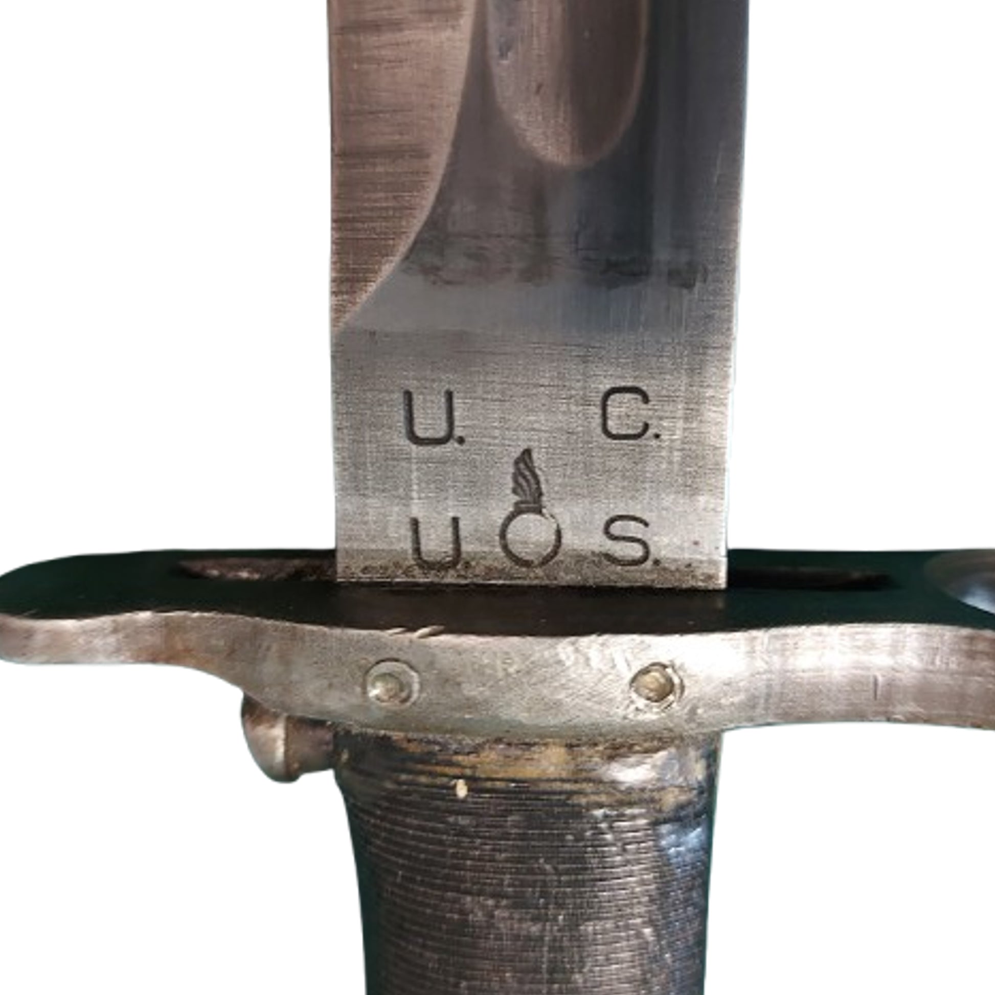 Measuring 14 1/2 inches overall with a 10 inch single fullered, spear point blade that is maker marked U.C. (Utica Cutlery) with U.S. and the flaming bomb below. 2 piece grooved grip panels and a functioning scabbard release button in place. With the dark green colored fibreglass and metal scabbard that is unmarked. Utica Cutlery manufactured these bayonets between 1943 and 1945. SKU: 63439